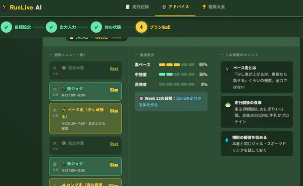 2026/03/20 09:53Run Live AI への応援 ありがとうございます新しいサービスを開発しました! https://www.run-live.jp/advice/【内容】 #毎日の練習記録#自己の走力と目標の大会カテゴリに応じた 「練習メニュー」を生成#3か月前から大会まで 毎日の練習メニューをAIが生成します 練習期間は任意#おすすめの大会を紹介● アカウント登録は不要です 無料で利用できます。 データはローカルのディバイスに保存されます。 もっと見るご利用ユーザーさん 増加中です