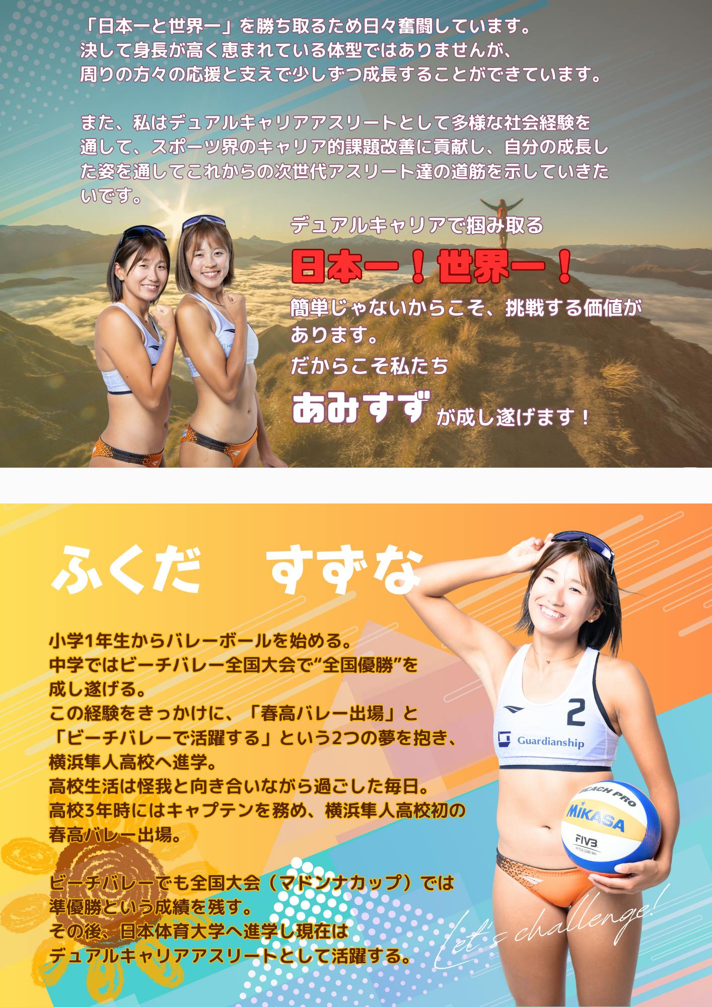 ※あみすずとは・・・あみ(白幡亜美)とすず(福田鈴菜)からなる、日本のビーバレー選手ペアです。