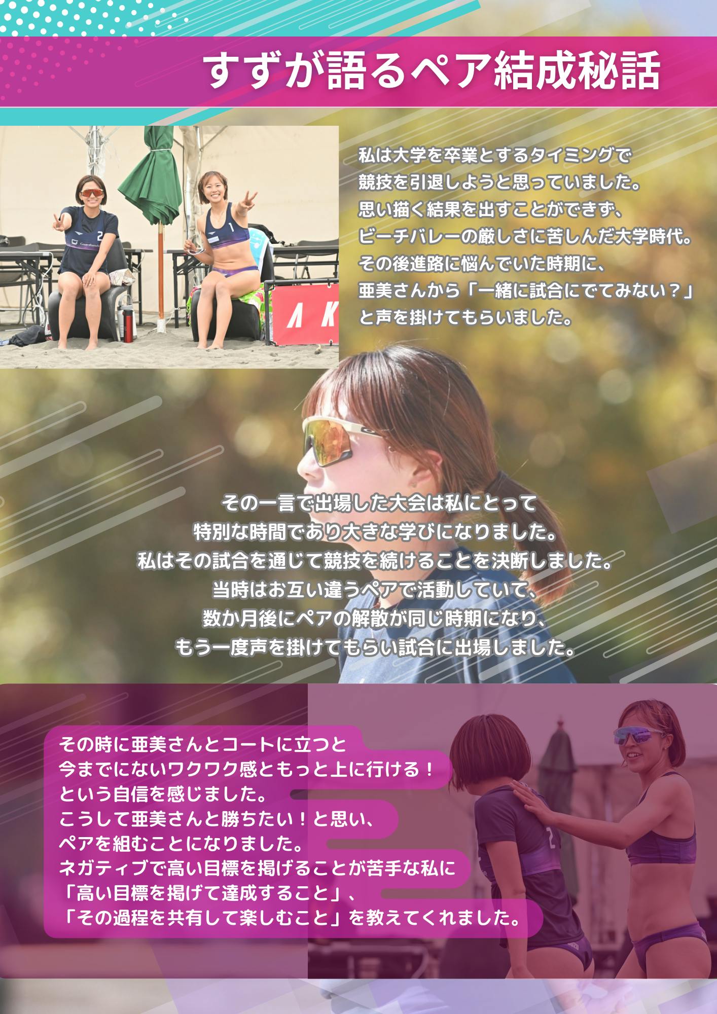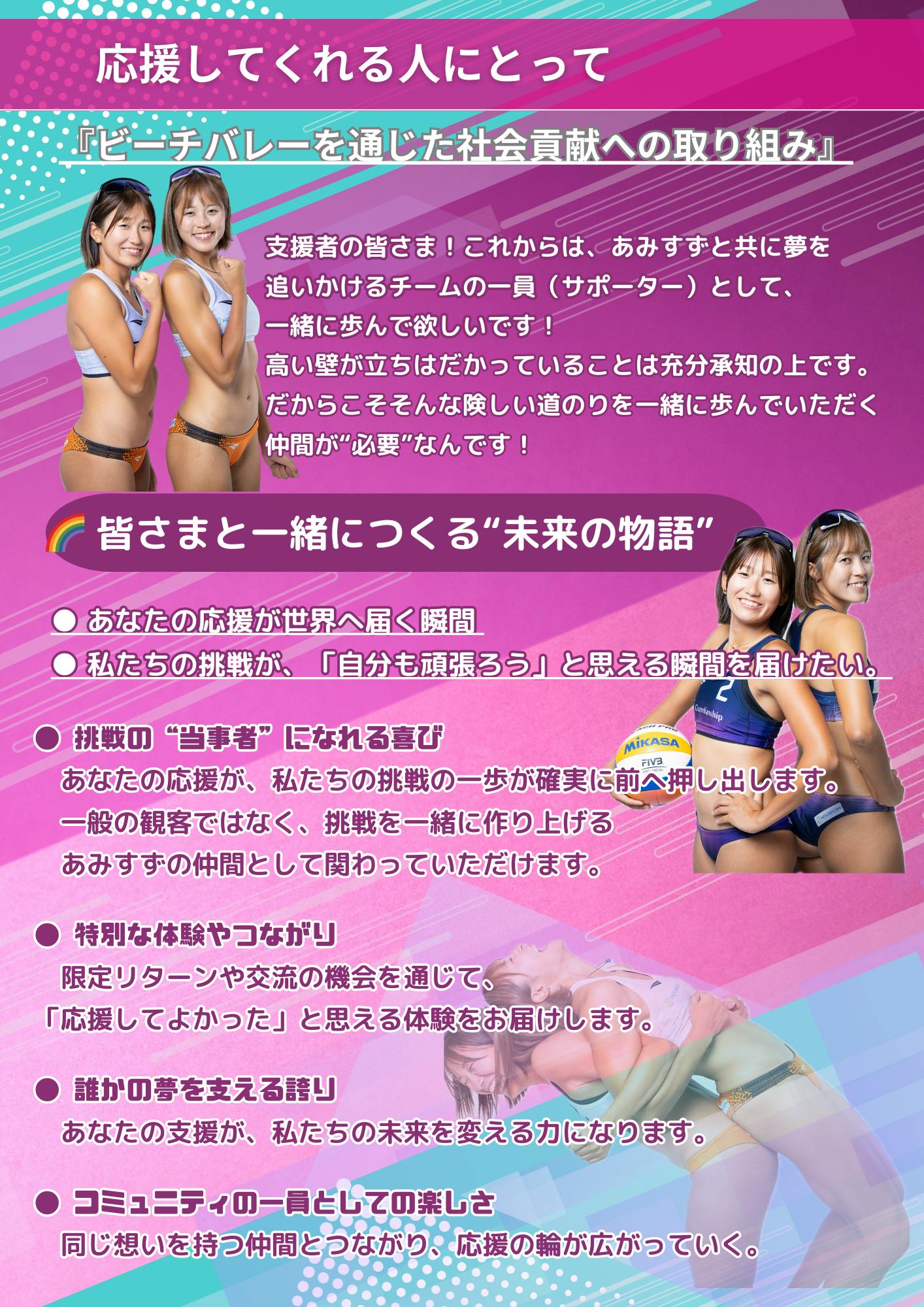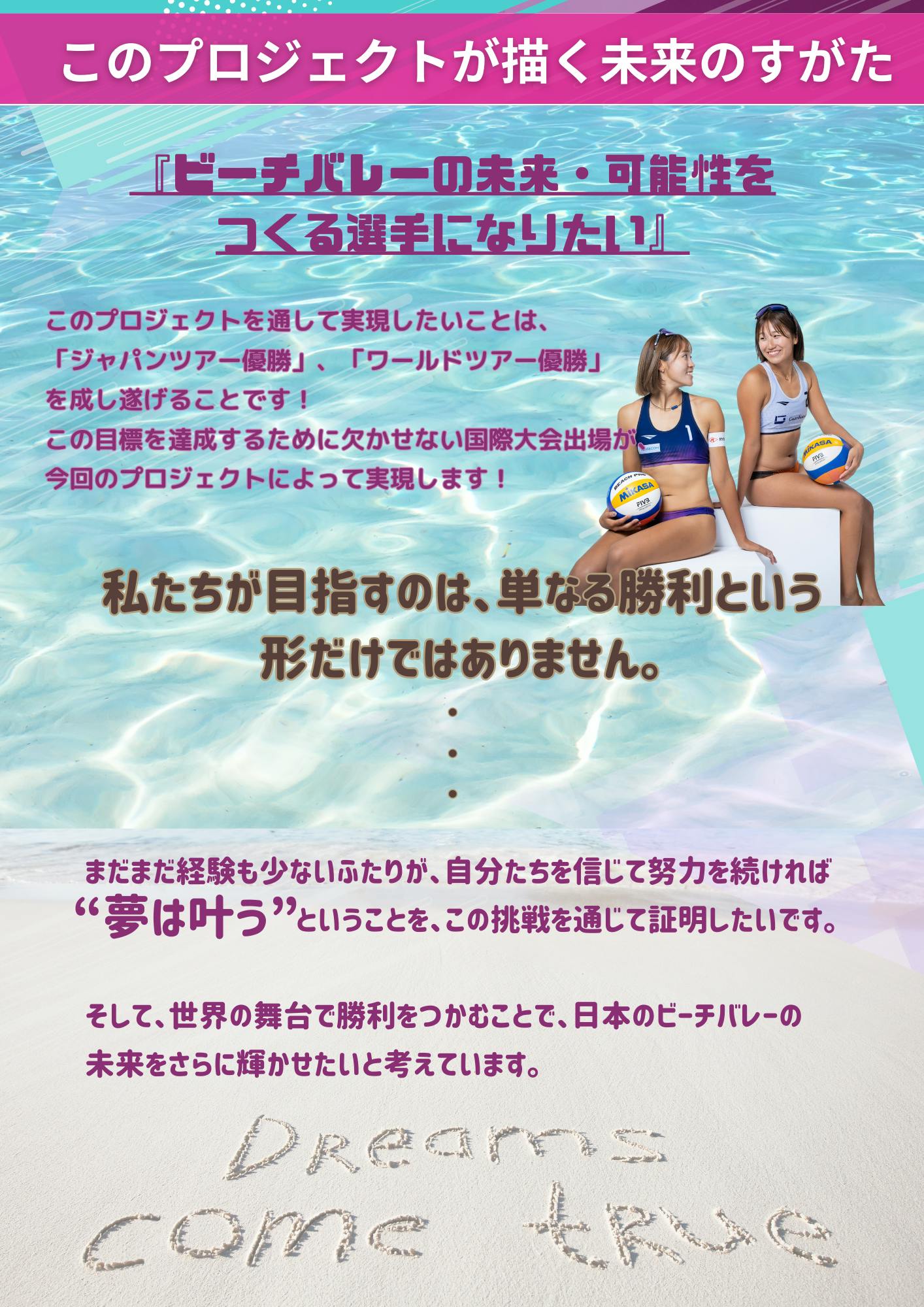 挑戦の過程を共有しながら、ビーチバレーの未来を一緒に創っていきたいと考えています。