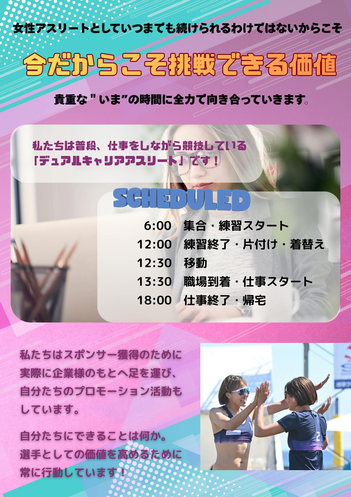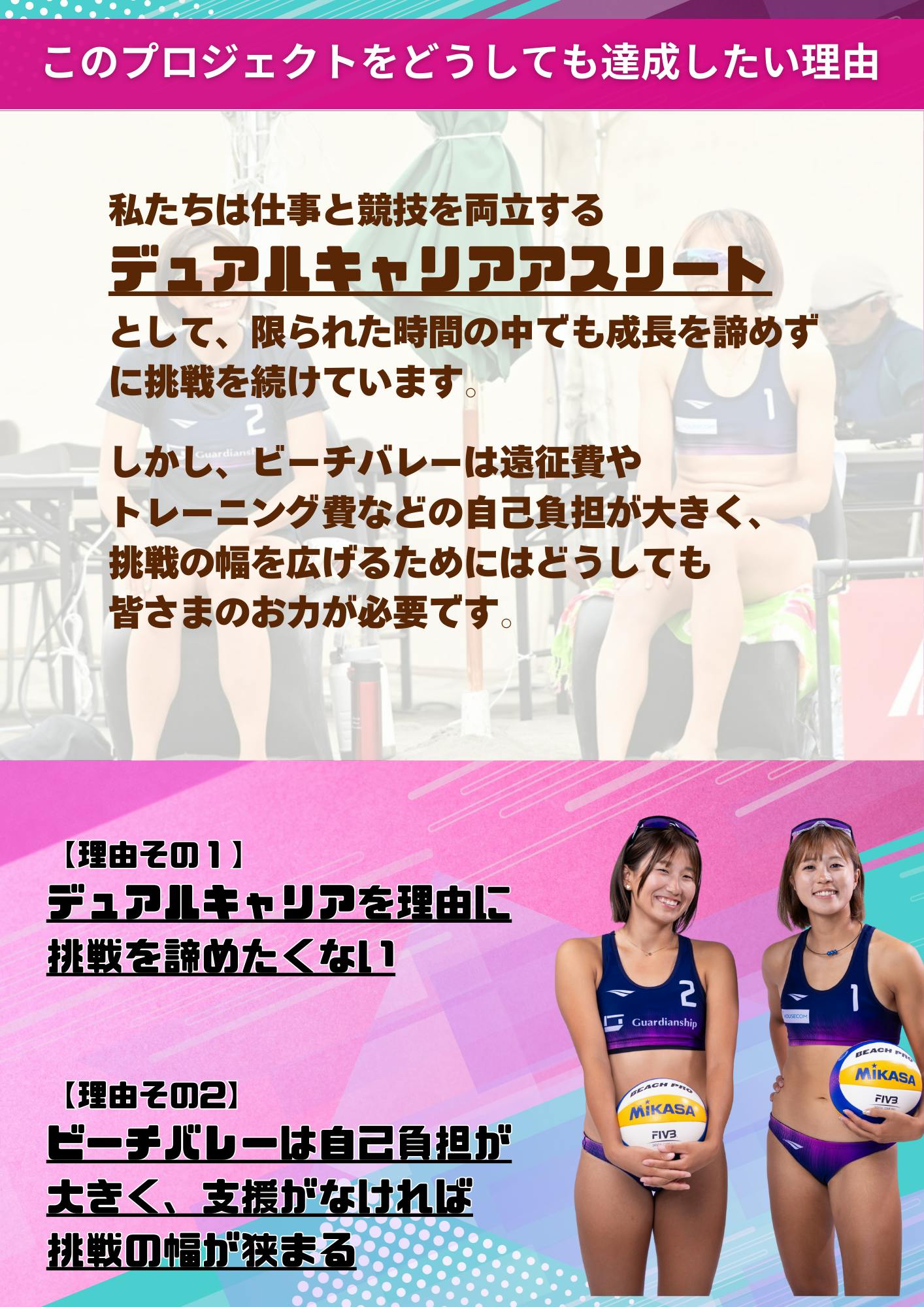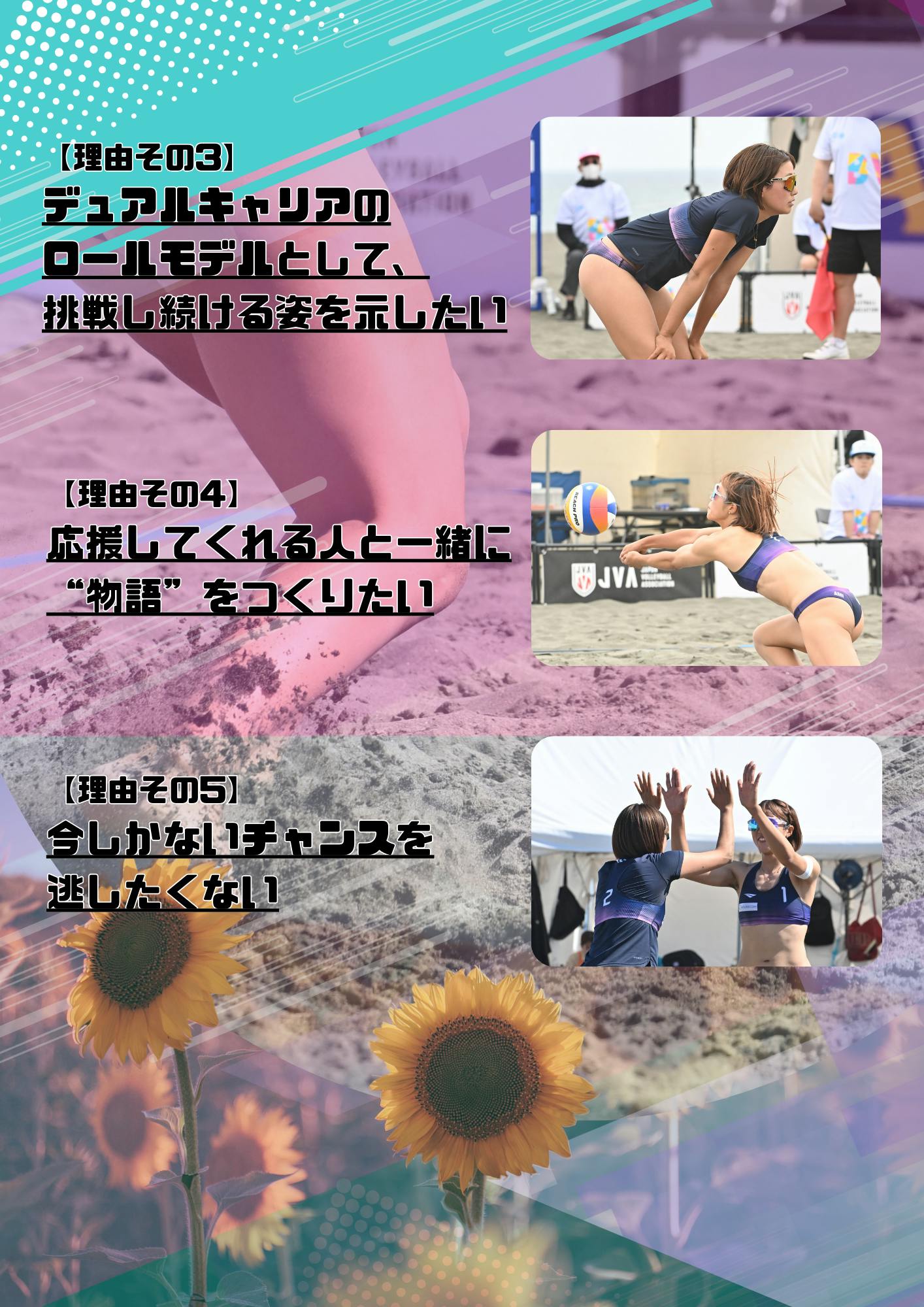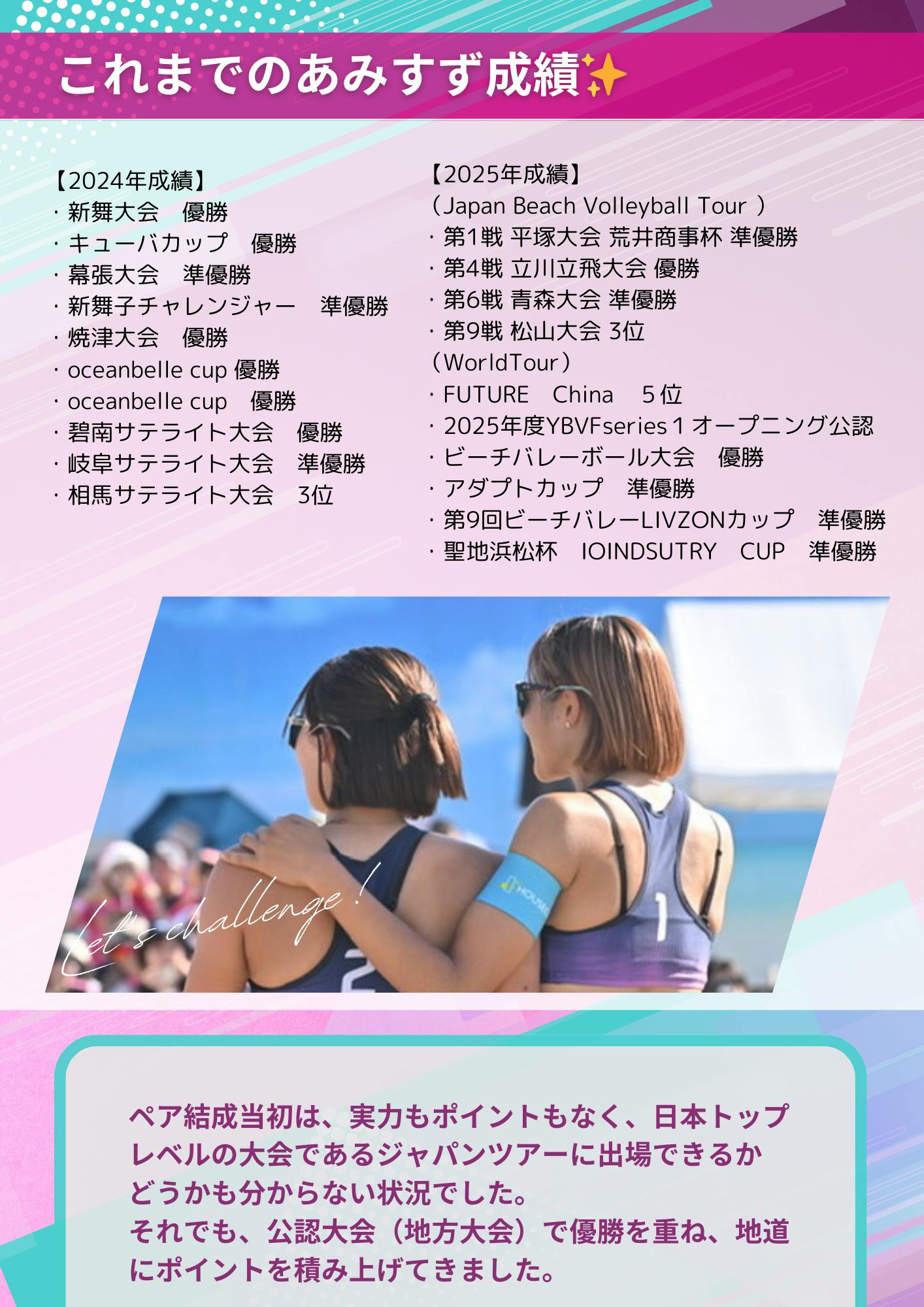 挑戦の過程を共有しながら、ビーチバレーの未来を一緒に創っていきたいと考えています。