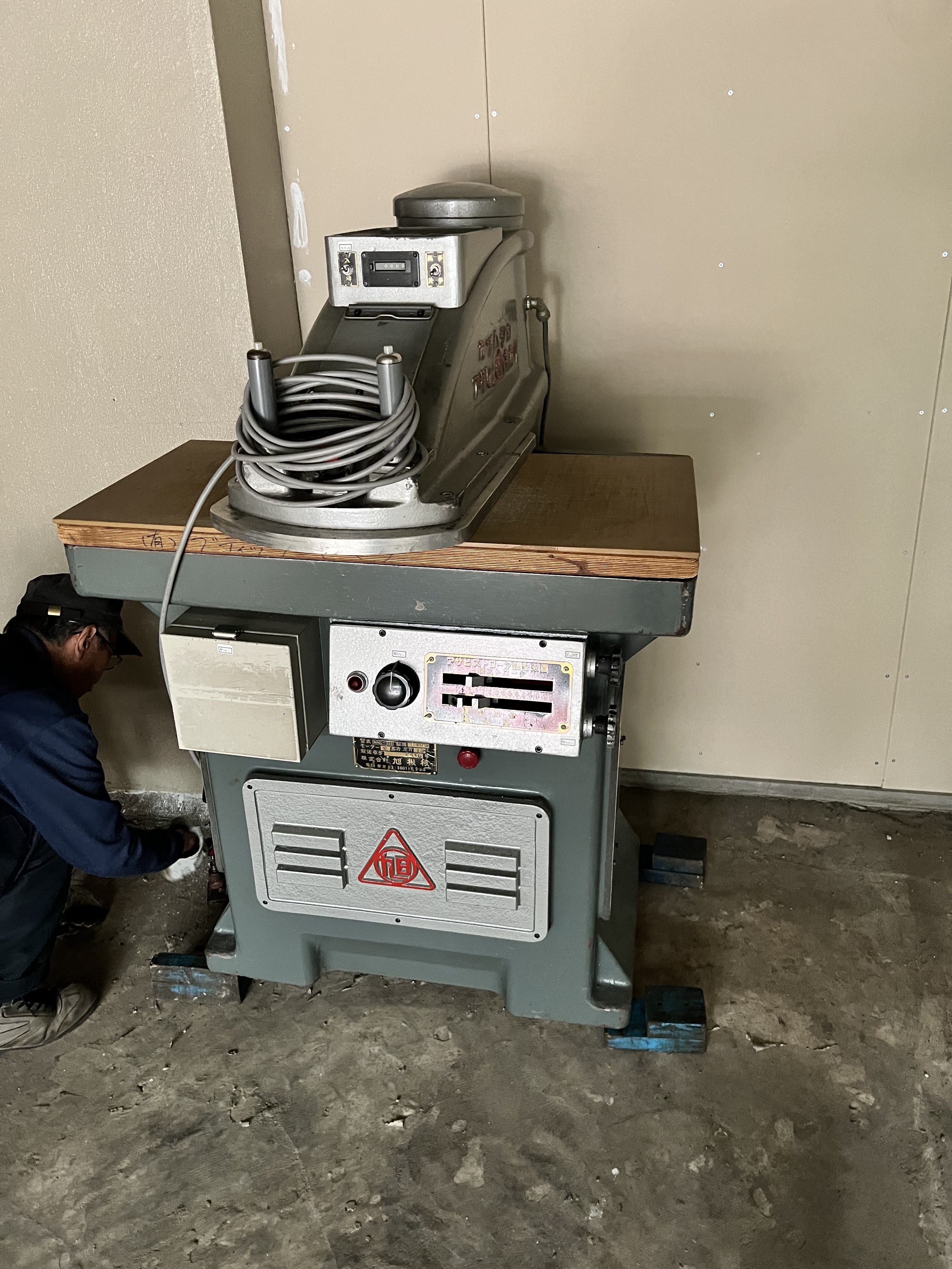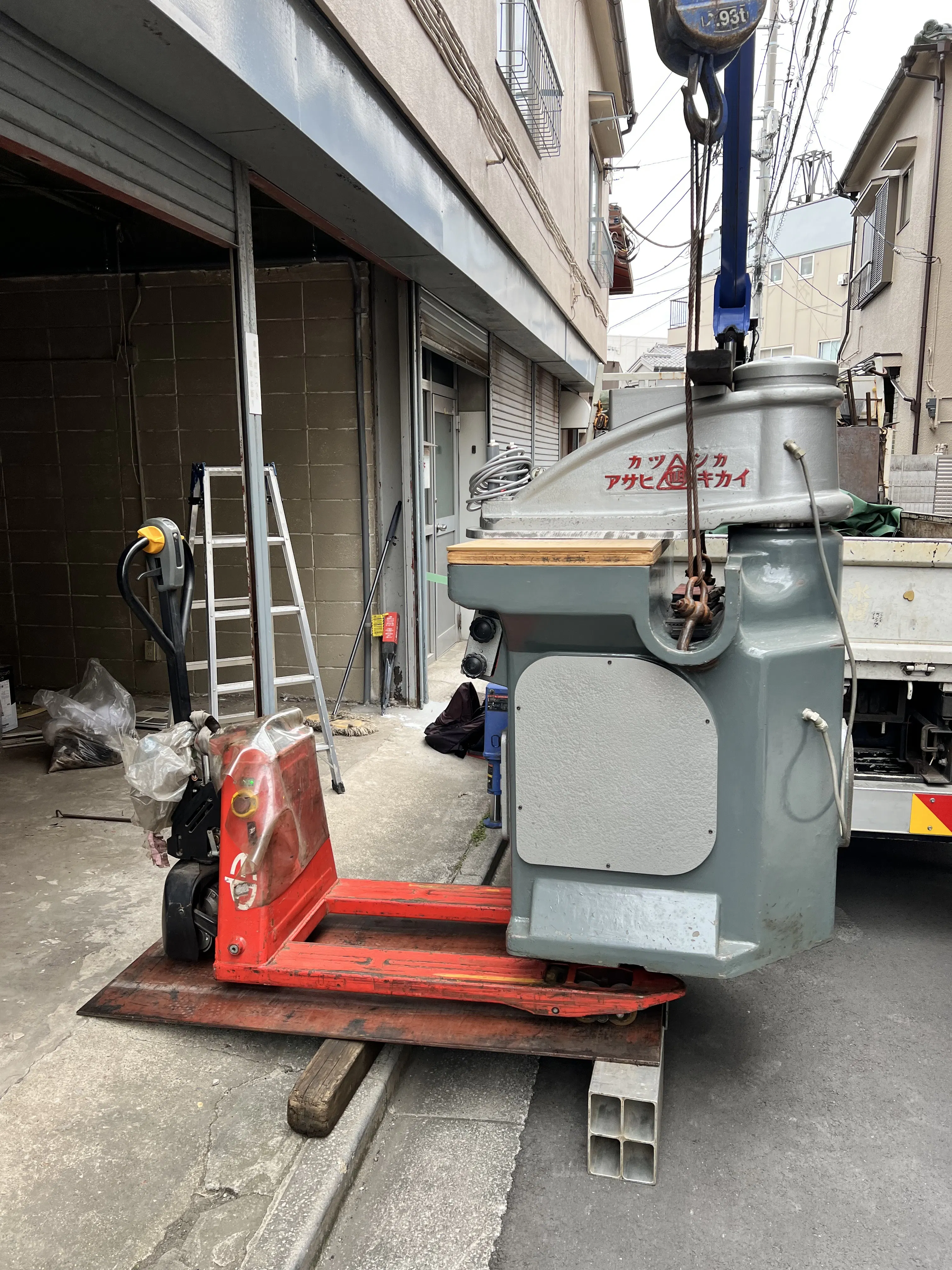 今日は、午前中に裁断機をクレーン車で工房へ運び入れました。