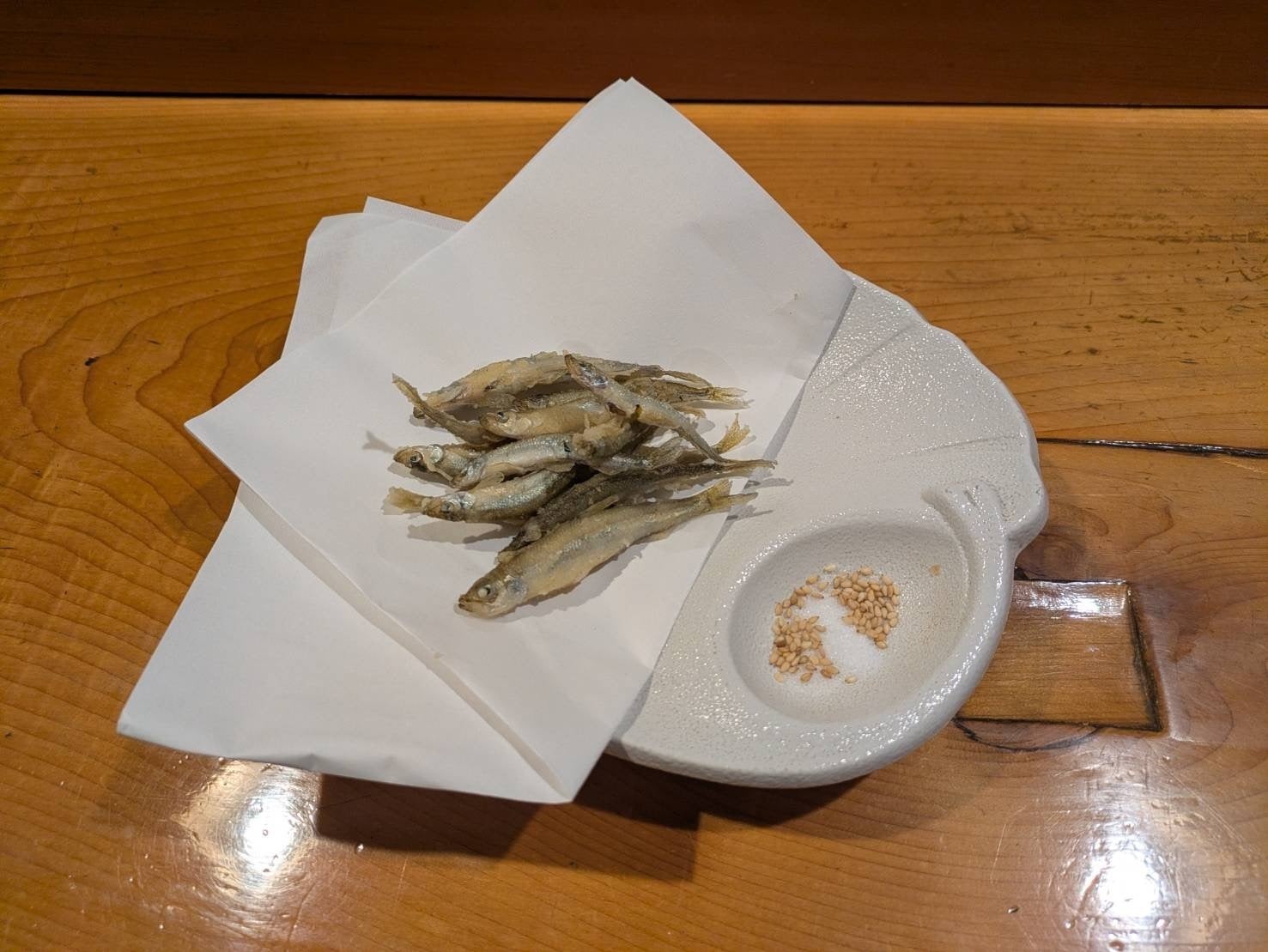 ヤリイカの足のバター炒めを、レタスを添えてアレンジしたことや、お客様が釣ってきたワカサギを、目の前で唐揚げにしてお出ししたこともあります。