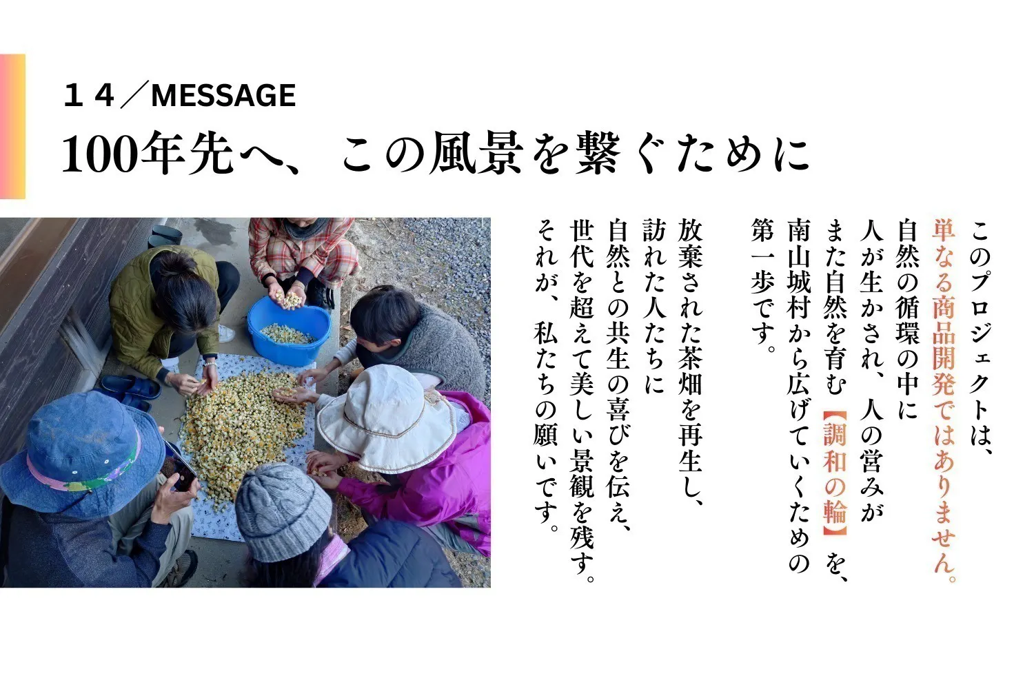 2026/03/27 08:59皆様、いつも温かいご支援をいただきありがとうございます。本日は、本プロジェクトの拠点である南山城村で、秋に開催する特別なイベント**「お茶の花摘み会2026」**についてご紹介します 。休耕茶園に咲く「白い宝物」を摘みませんか?私たちが再生に取り組んでいる休耕茶園には、秋になると可憐な白いお茶の花が咲き誇ります 。 実はこのお茶の花には、ほのかな甘い香りとともに、肌に嬉しい成分がたっぷりと詰まっているのです。今回のイベントで皆様に摘んでいただくお茶の花は、私たちのオリジナルブランド**「few」の化粧品原料**として大切に使用されます 。 自分が摘んだ花が、美しさを支える製品に生まれ変わる——。そんなワクワクする循環を、ぜひ一緒に体験していただきたいです。 このイベントだけの「至福のポイント」「自然との一体感」: 爽やかな秋空の下、茶花の優しい香りに包まれて過ごす時間は、まさに至福のひとときです 。「贅沢な「村の恵み」ランチ」: お昼には、地元の味が詰まった**「茶どころ弁当」と「村茶」**をご用意 。さらに、おやつやお土産まで付いた盛りだくさんの内容です 。「嬉しいお土産」: 摘んだお茶の花はお持ち帰りいただけるほか、**「しょうちゃんのお米3kg」**もプレゼントいたします 。「地域を満喫」: 集合場所の近くには、人気の「道の駅 お茶の京都 みなみやましろ村」もあり、村の魅力を丸ごと楽しめます 。開催スケジュール(9月〜11月)週末やお休みの日を中心に、計10回開催いたします。ご都合の良い日程をお選びください。9月: 27日(日)、28日(月) 10月: 10日(土)、12日(月祝)、24日(土)、26日(月) 11月: 7日(土)、9日(月)、23日(月祝)、24日(火) (時間はいずれも 10:00〜15:00 です) ご参加にあたって集合: お車の方は「旧高尾小学校」 電車の方は「JR月ヶ瀬口駅」へお越しください(送迎いたします) 服装: 長袖・長ズボン、汚れてもいい靴(または長靴)、帽子を ご用意ください 。お申込みは「クラウドファンディング」のリターンから!この「お茶の花摘み体験」は、本プロジェクトのリターンとしてお選びいただけます 。 皆様の支援が、茶園の風景を守り、新しい価値を生み出す力になります。南山城村の美しい秋を、ぜひ五感で楽しみに来てください。皆様のご参加を、エコ・クリエ一同、心よりお待ちしております! もっと見る