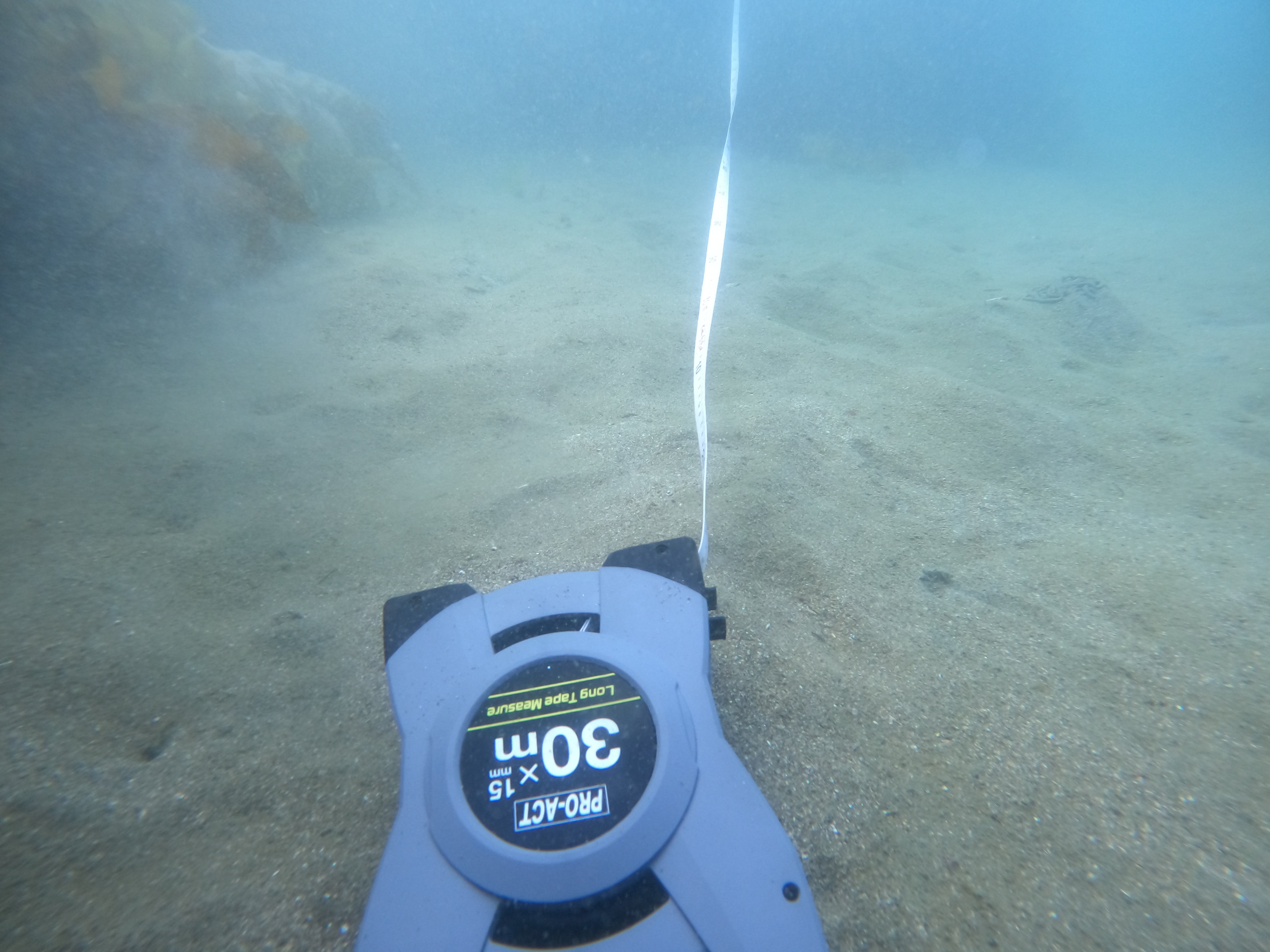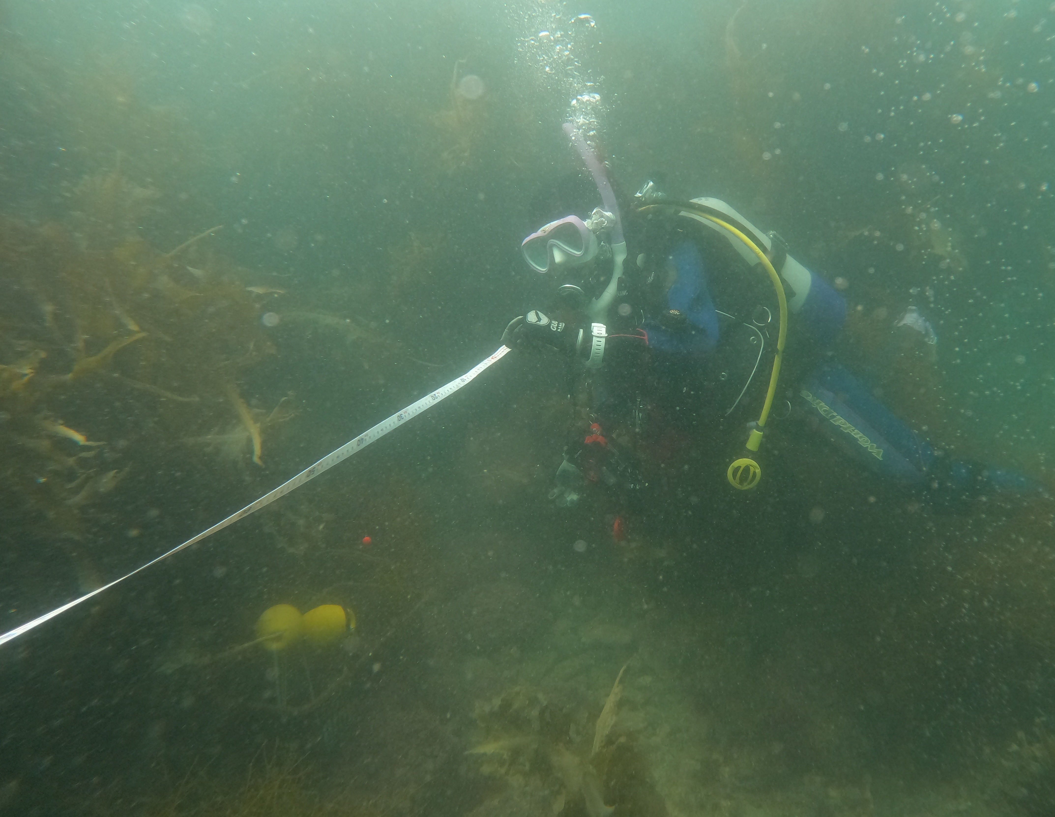 メジャーで距離を測り、ダイブコンピューターで水深を確認しながらデータ収集を行い、