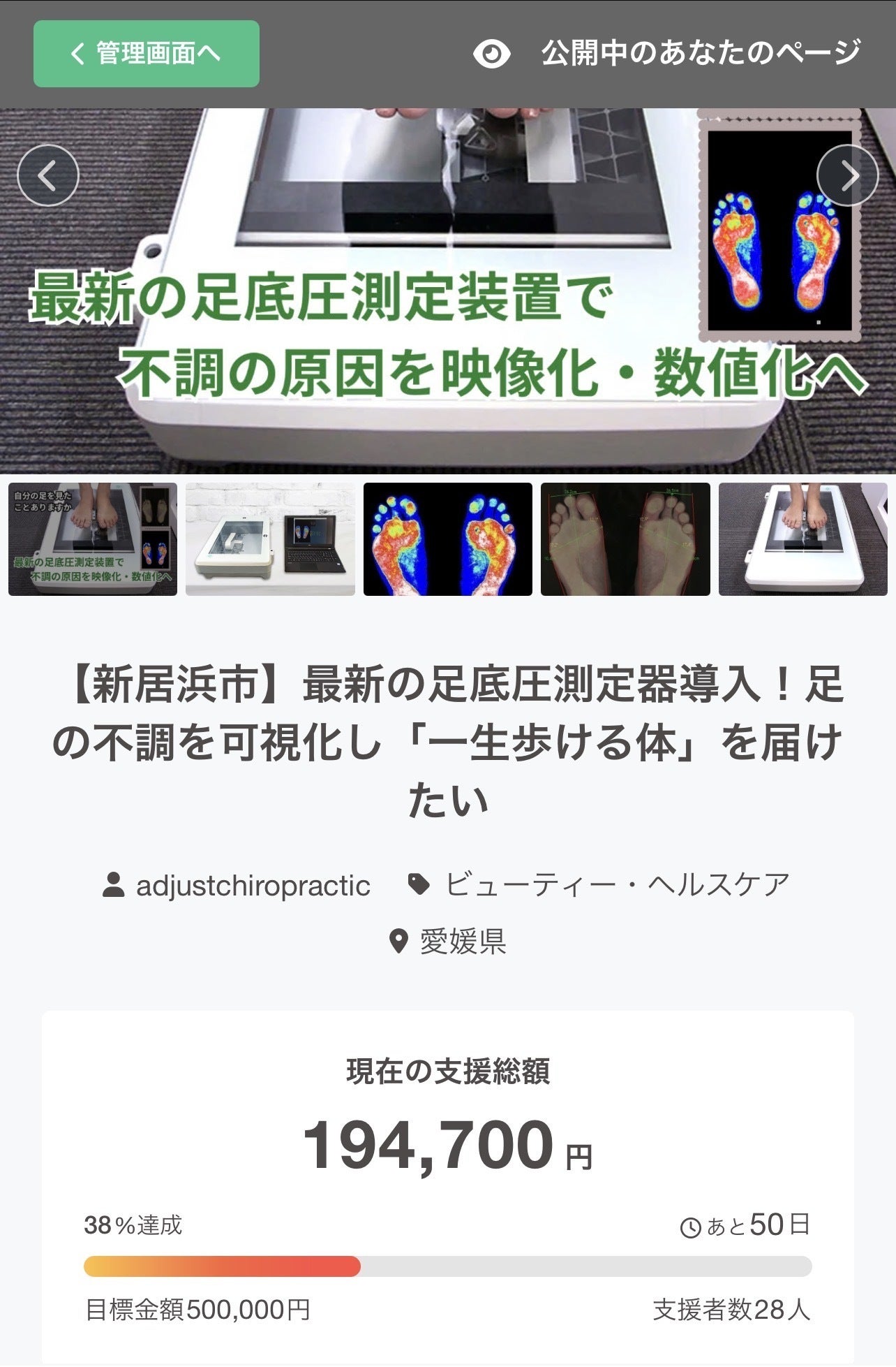 2026/03/20 00:00いつも「あじゃすと整体」のプロジェクトを応援いただき、誠にありがとうございます。3月13日に公開した本プロジェクトですが、昨日で開始からちょうど1週間が経過いたしました。この1週間で、驚くほど多くの方から温かいご支援と励ましのメッセージをいただき、現在達成率37.3%まで到達することができました!▽ 現在の状況• 支援総額: 186,700円• 支援者数: 26名• 達成率: 37.3%プロジェクト初日からアクセル全開で応援してくださった皆さまには、感謝の言葉もございません。一人ひとりの想いを大切に受け止め、足圧測定器の導入に向けた準備をさらに加速させてまいります。▽ さらなる「支援の輪」を広げるためのお願い目標達成までは、まだ道半ばです。クラウドファンディングは、開始直後と終了直前に支援が集まりやすい一方で、中盤のこの時期にどれだけ多くの方に知っていただけるかが成功の鍵を握っています。皆さまの周りで、「外反母趾、巻き爪、魚の目で困っている」「歩き方や姿勢に悩みがある」「いつまでも自分の足で元気に歩きたい」という方がいらっしゃいましたら、ぜひ本プロジェクトのことをご紹介いただけないでしょうか。SNSでのシェア(拡散)も大きな力になります。https://camp-fire.jp/projects/925862/view▽ 最後にこのプロジェクトは、単に設備を導入するだけでなく、新居浜市の皆さまの健康を足元から支える「新しい一歩」にしたいと考えています。引き続き、最後まで全力で走り抜けますので、変わらぬ応援をどうぞよろしくお願いいたします!あじゃすと整体福田恭一 もっと見る