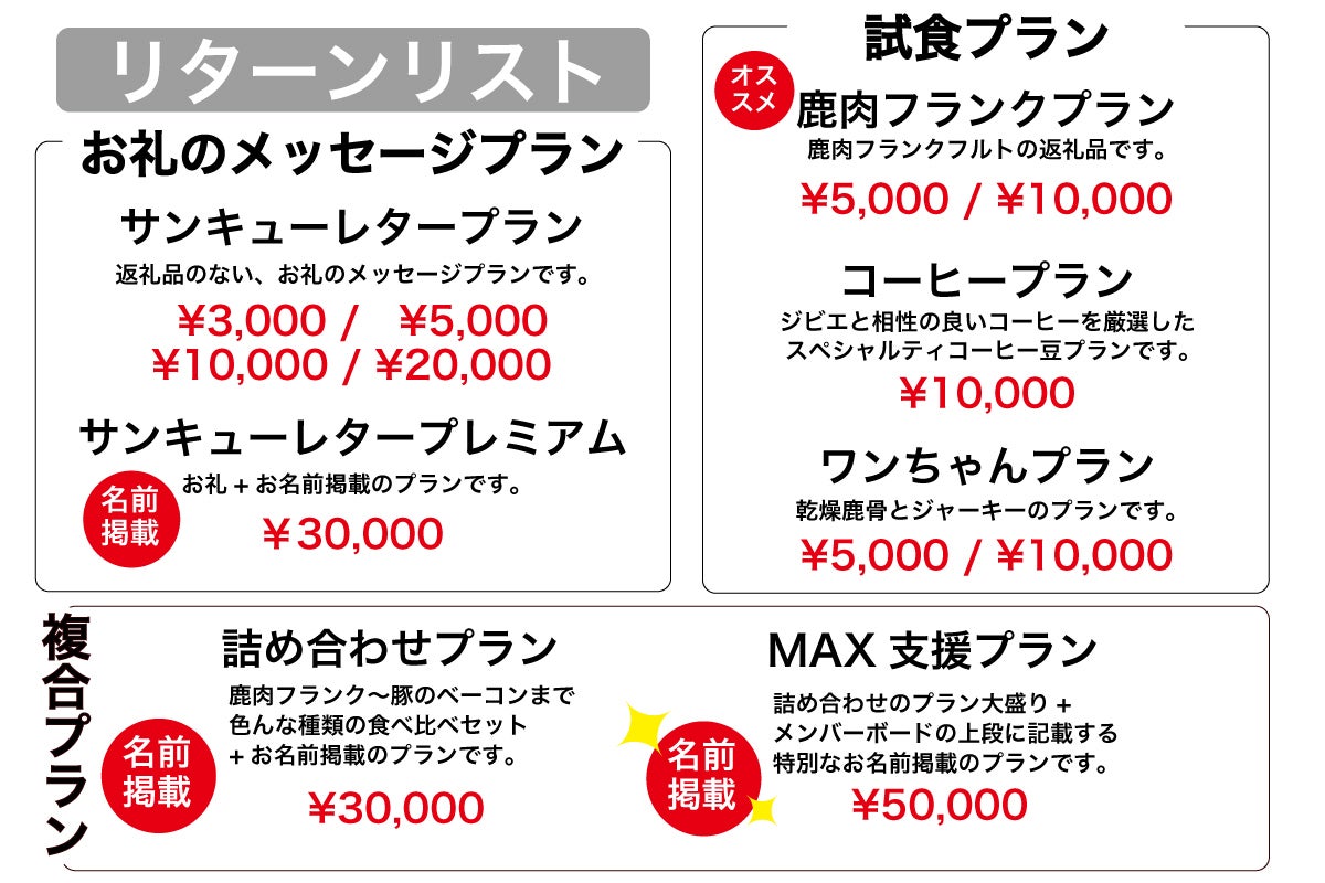 目標金額に達しない場合にも、ご支援いただいた方へのリターン品の発送や新事業の活動を行ないます。
