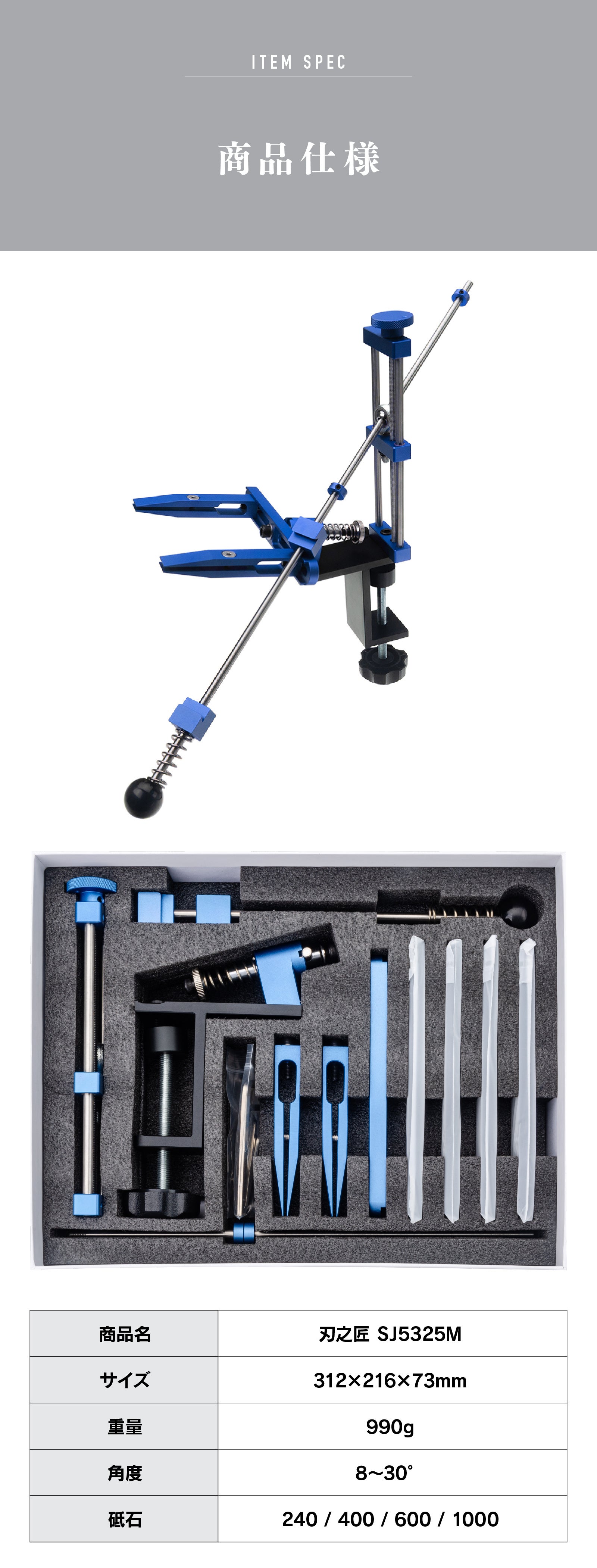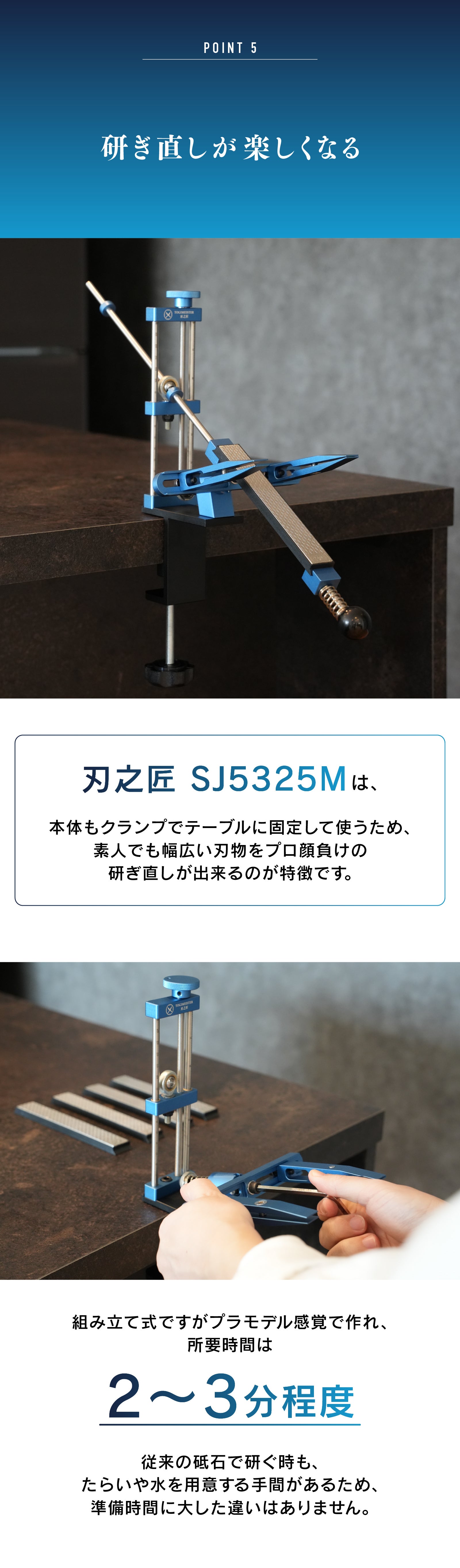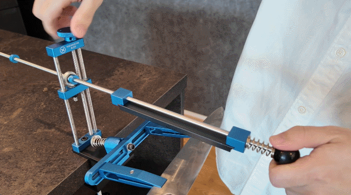 テーブル固定式クランプで両手が使える安全設計を実現。木工職人、シェフ、アウトドア愛好家など多様なユーザーと実地テストを重ね、刃角を記録・再現できる仕組みも完成させました。専門家でなくてもプロ級の研ぎを簡単に実現できる製品の誕生です。