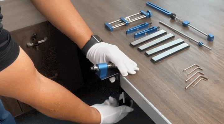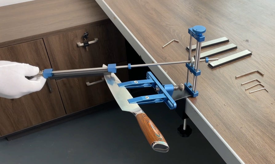 A : 取扱説明書を見ながら組み立てれば簡単にできます。道具は同封の六角レンチのみで慣れると約2分で完成します。包丁は固定具でしっかり固定するため、片手で砥石棒を前後するだけで約5分で簡単に研げます。