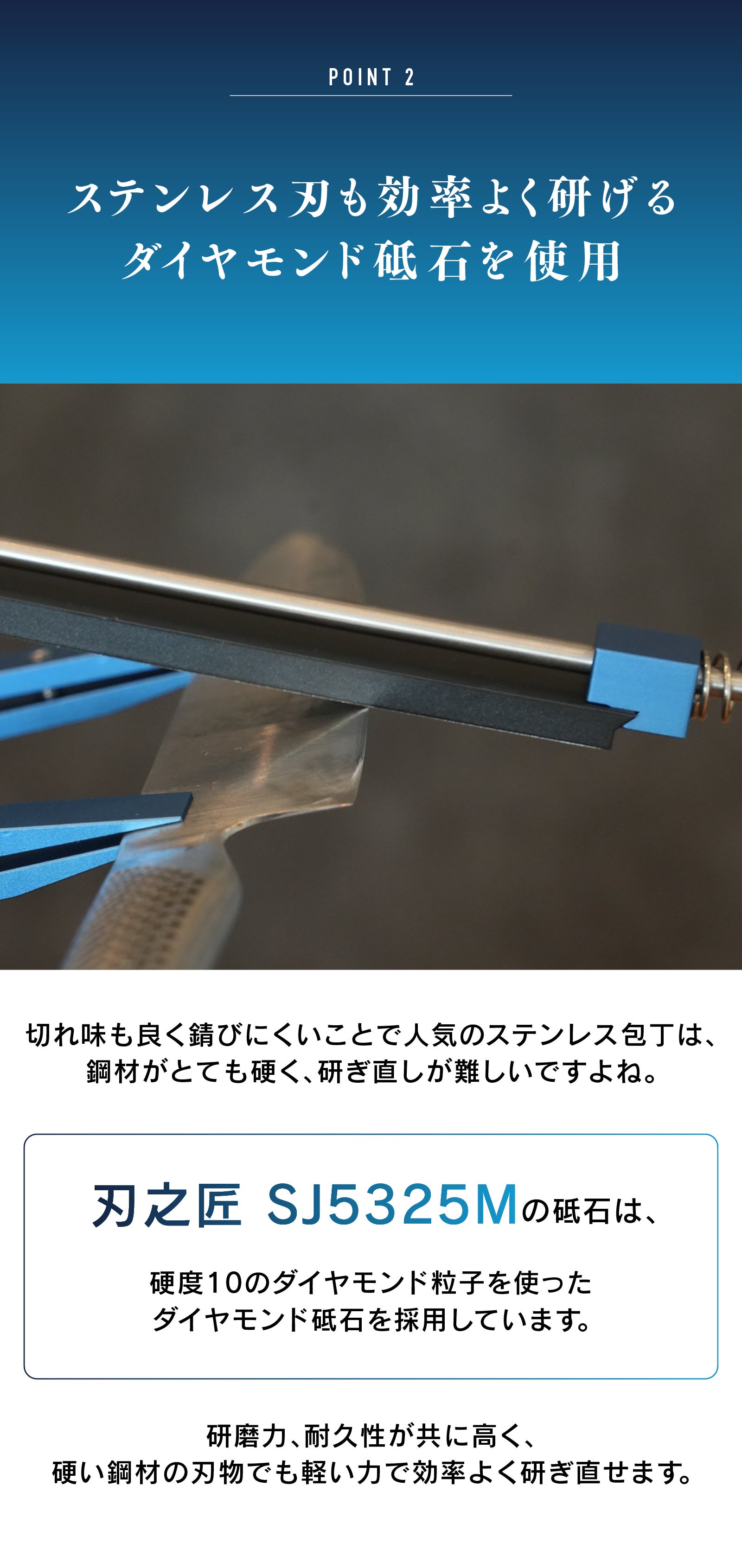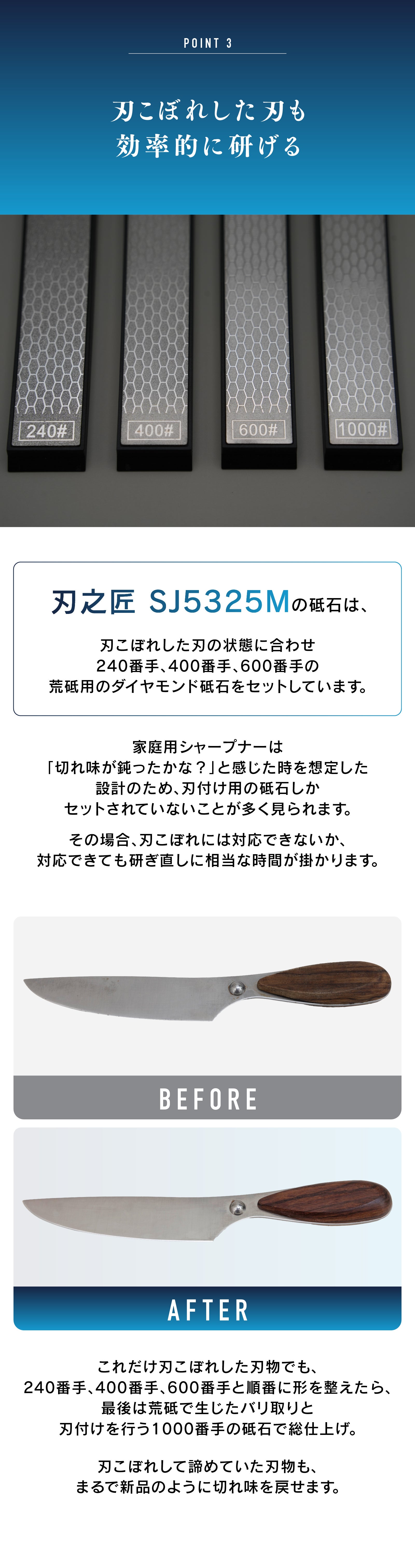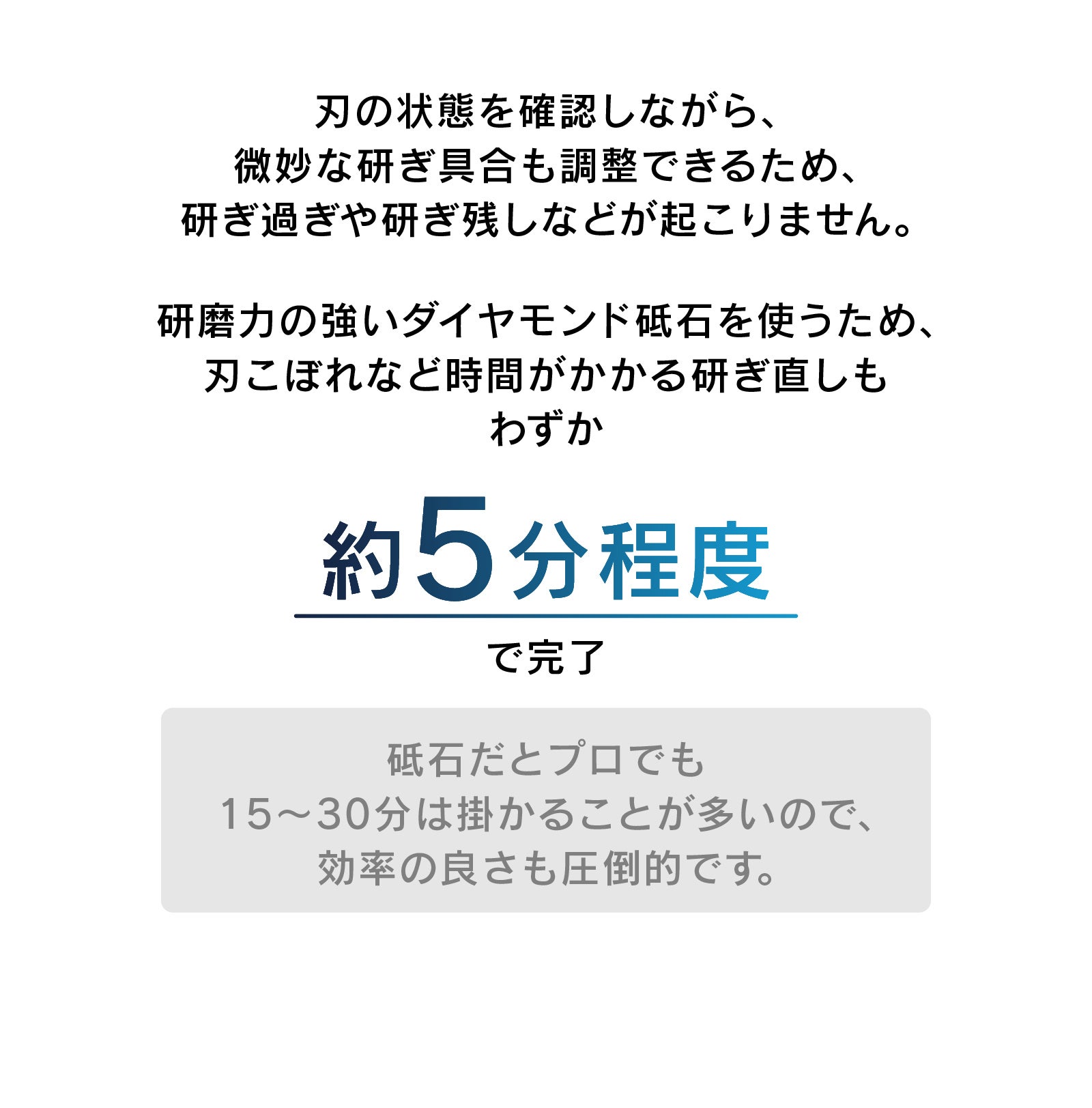A : 本製品はダイヤモンド製の研ぎ板を使用しており、一般的な砥石より研ぎ効率が高く、摩耗に強く長持ちします。お手入れは消しゴムで軽く擦るだけで汚れが簡単に落とせます。