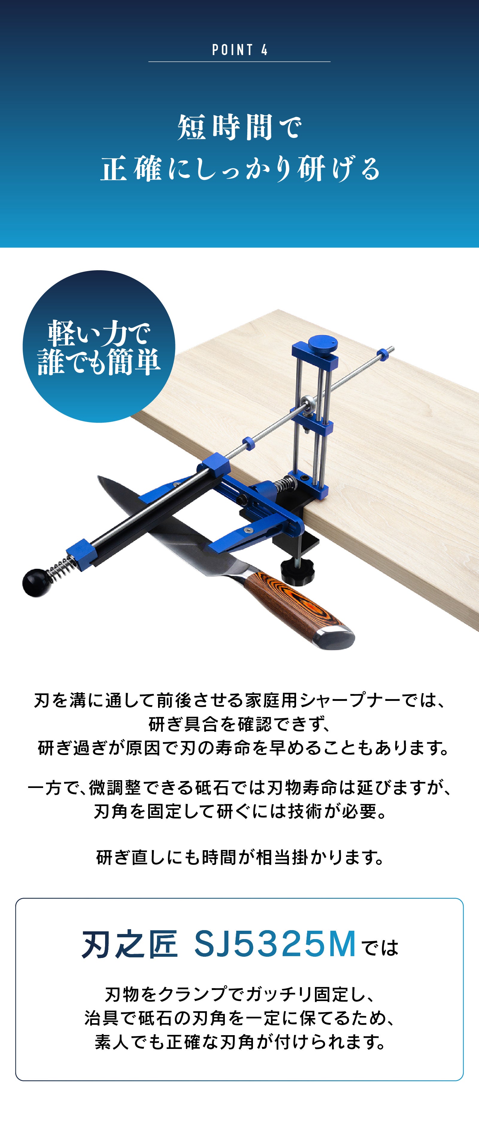 機械工学と調理の両方に精通する開発責任者は、従来の砥石や簡易研ぎ器では手作業に揺れるため角度がぶれ、刃先の歪みや切れ味が安定しないという問題を目の当たりにしていました。