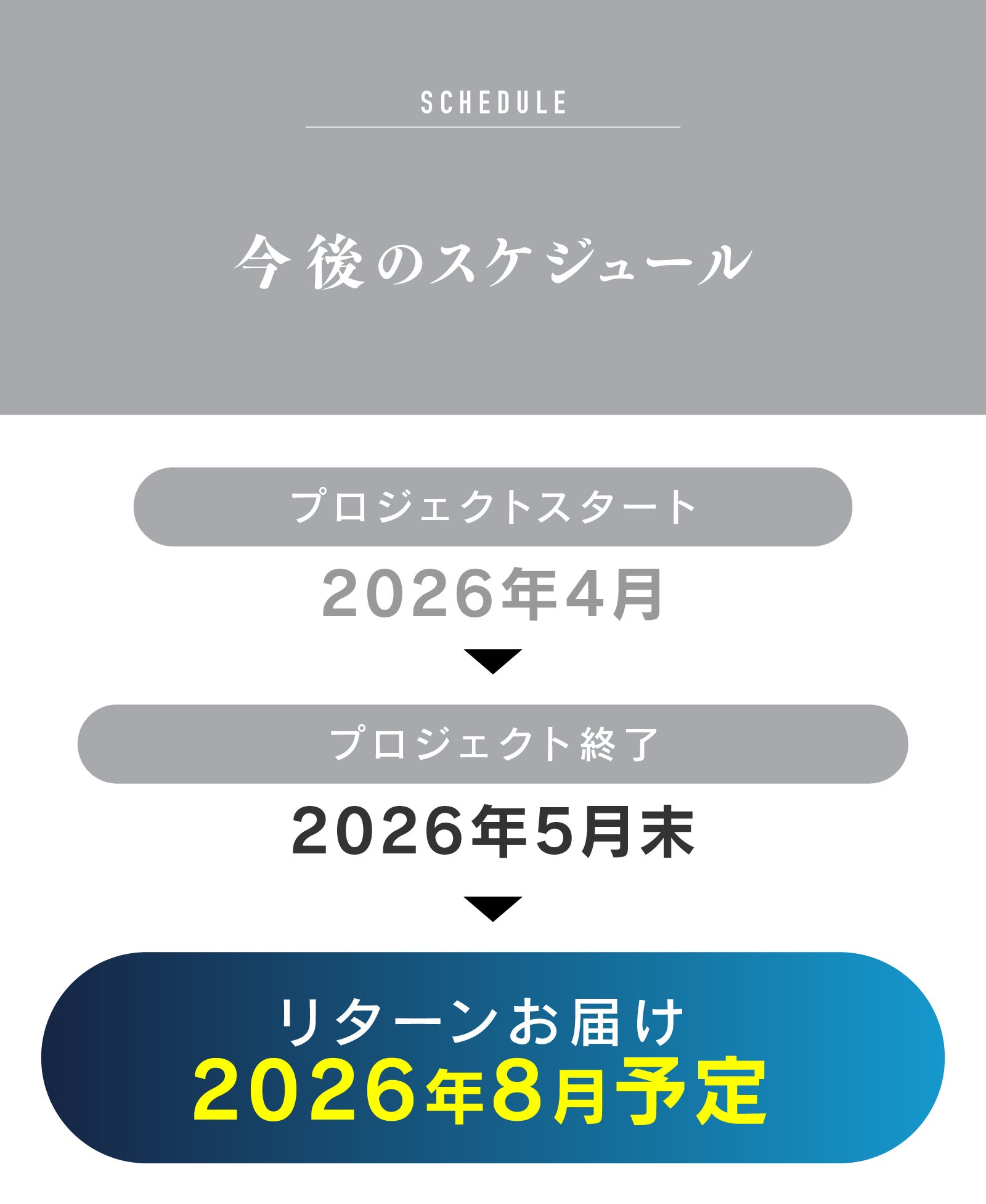 ●引渡し時期: 各リターン詳細に記載の発送予定月を引き渡し時期とします。但し、開発・生産状況によって遅れが生じる場合がありますのでその際は当プロジェクトページ内の「活動報告」または購入者へのメール等で連絡します。