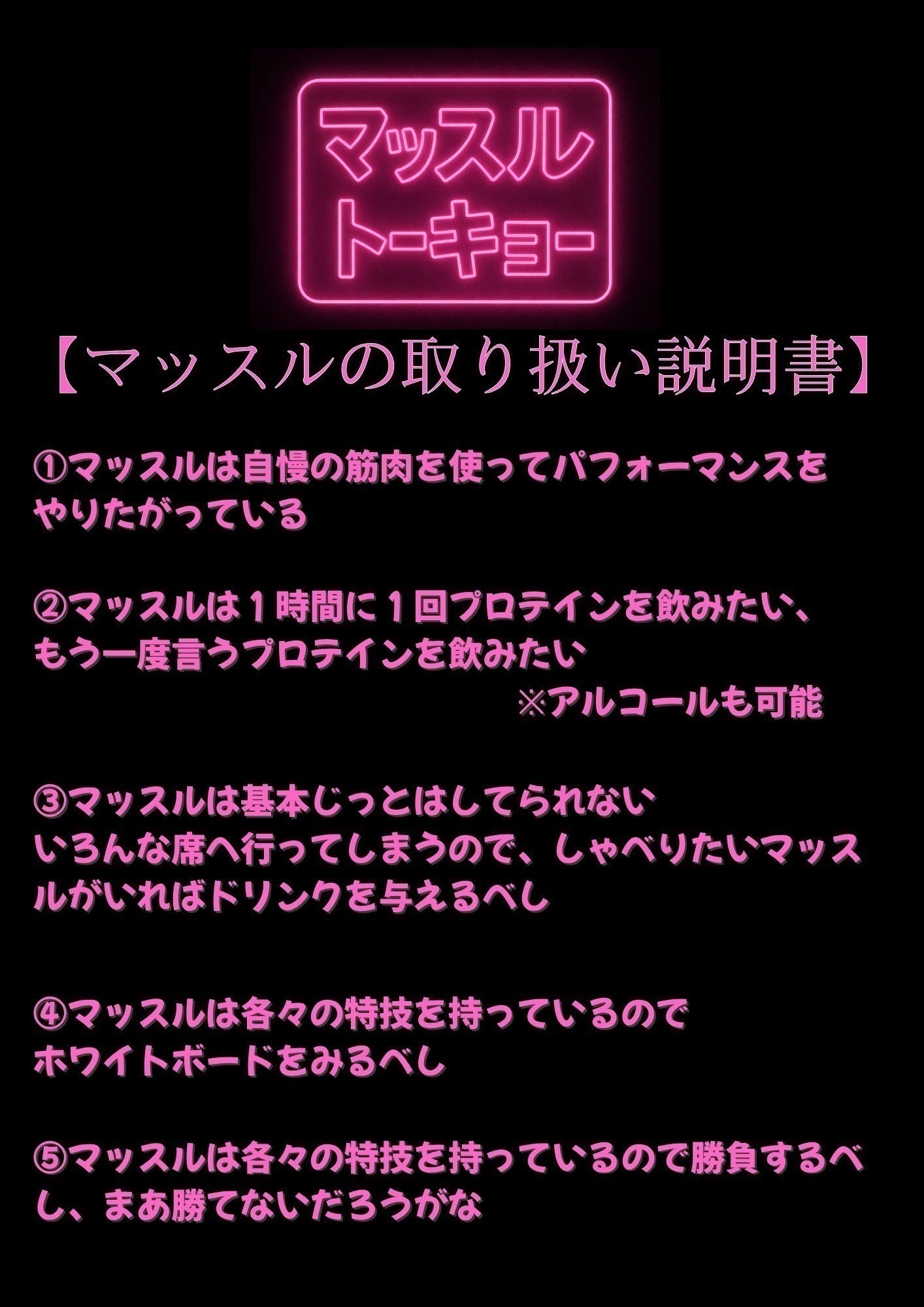 マッスルトーキョーはただのマッスルバーではありません。以下の3つの武器を持ってみなさまをおもてなしいたします!