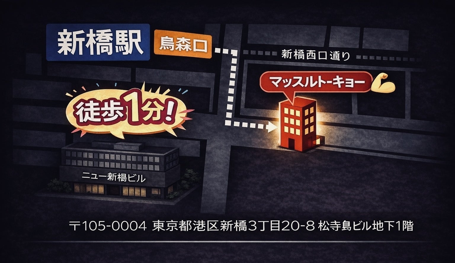 まず、「筋肉酒場マッスルトーキョー」はJR新橋駅より徒歩30秒!超駅近です!