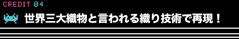 少しのズレも許されないスペースインベーダーのドット絵に対し、泥染めによる先染めを行い、30〜40の工程をえて、世界一緻密な織物と言われる本場奄美大島紬を織る高い技術で織り上げていきます。