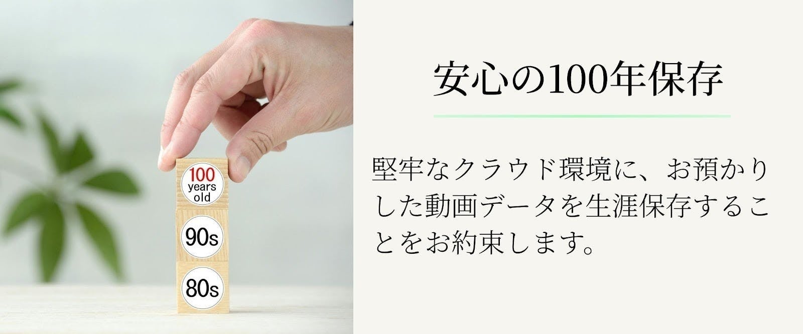 A. 理由は2つあります。1つ目は、商品のご購入代金に長期のデータ保管費用が含まれているためです。2つ目は、最新のセキュアなクラウド技術を活用し、動画データを最適化(軽量化)して保管する仕組みを構築しているため、維持コストを最小限に抑えられているからです。買い切りで、大切な思い出をずっと守り続けます。