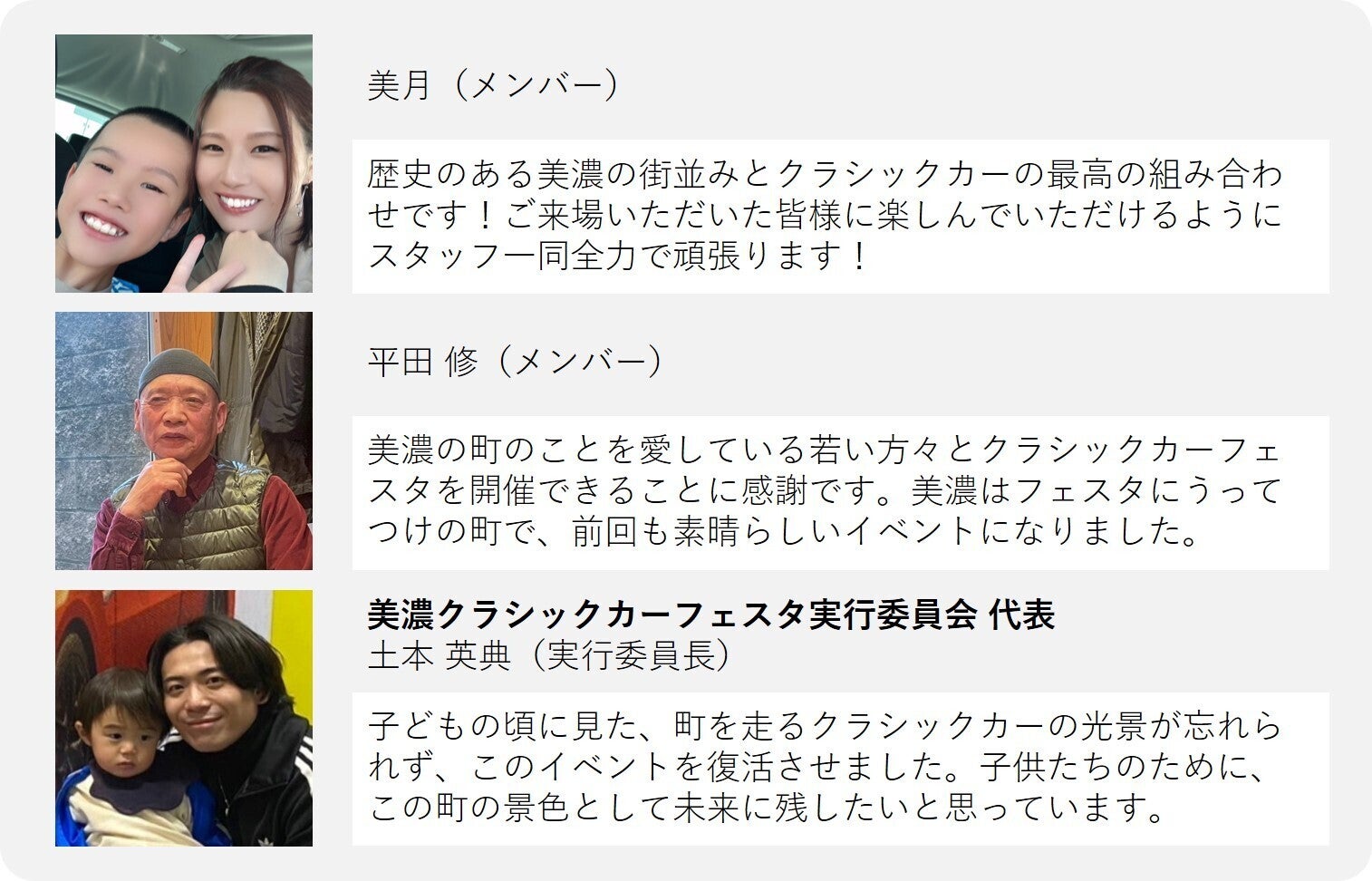私たち実行委員会は、この美濃クラシックカーフェスタを2026年以降も継続して開催し、子供たちが大きくなった時に「僕・私の地元にこんな楽しいイベントがあるから行こうよ!」「美濃市っていいところなんだよ!」といった風に自慢できるイベントに育てていきたいなと思っております!