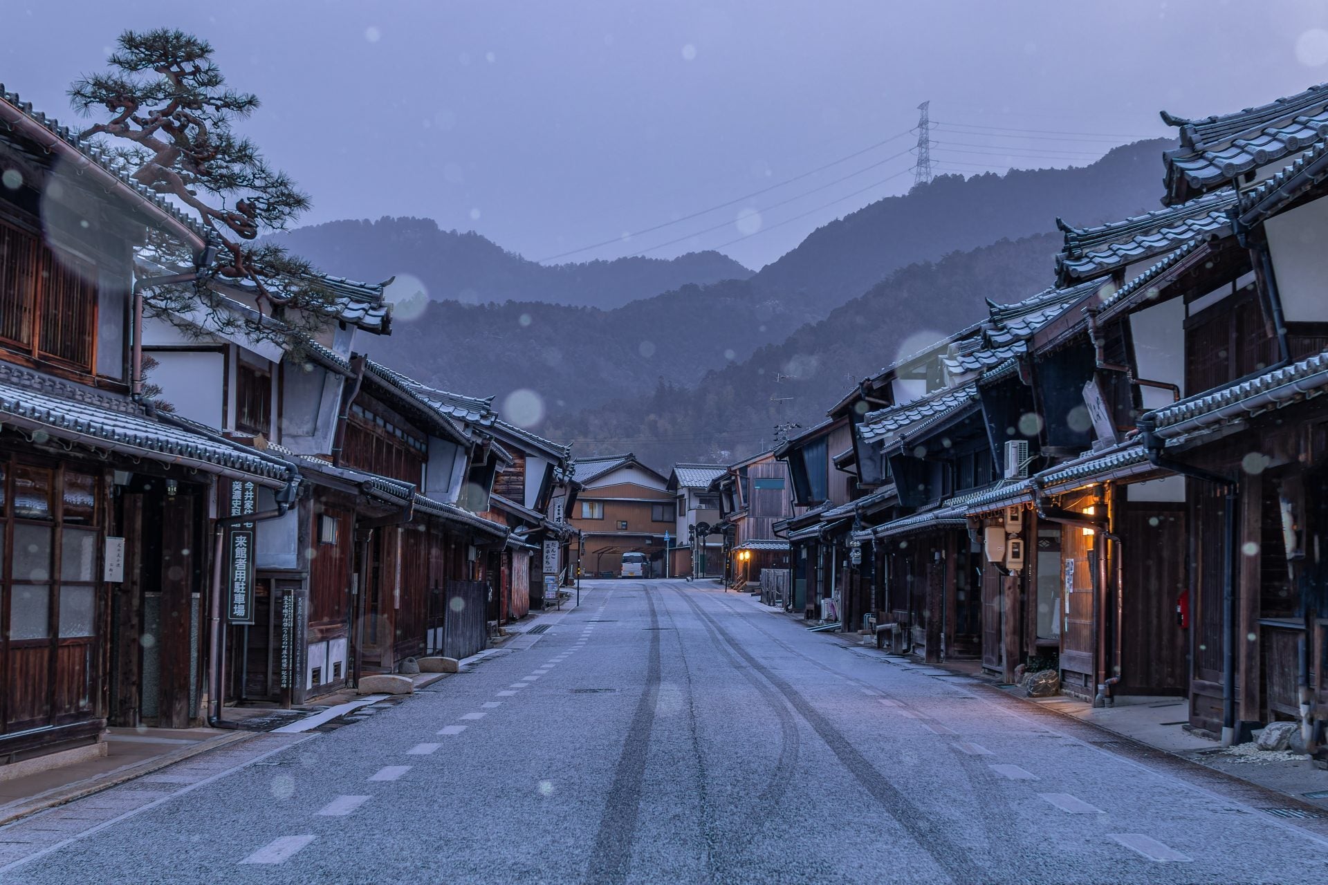 うっすらと雪化粧をした「うだつの上がる町並み」(冬)