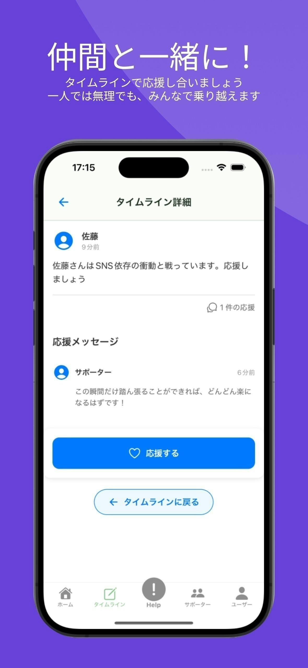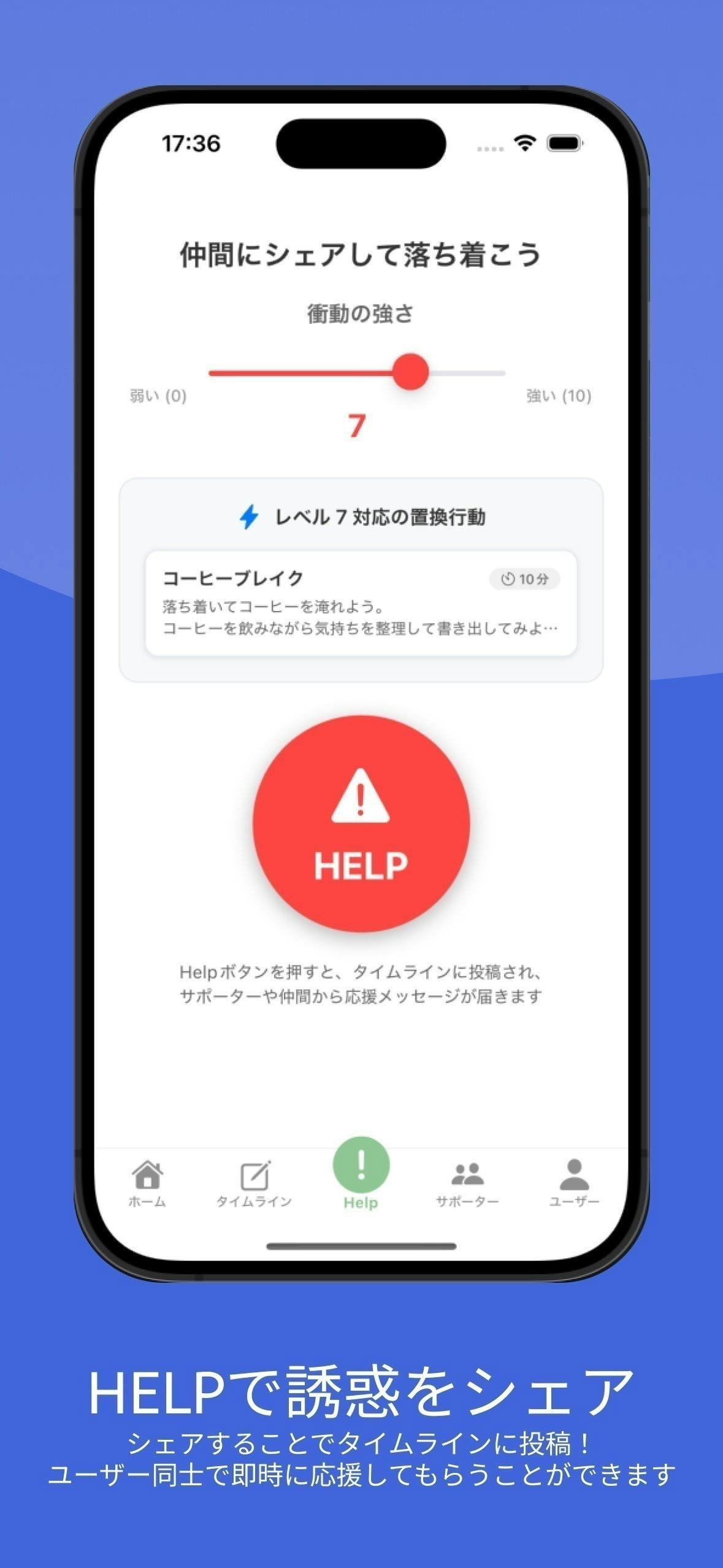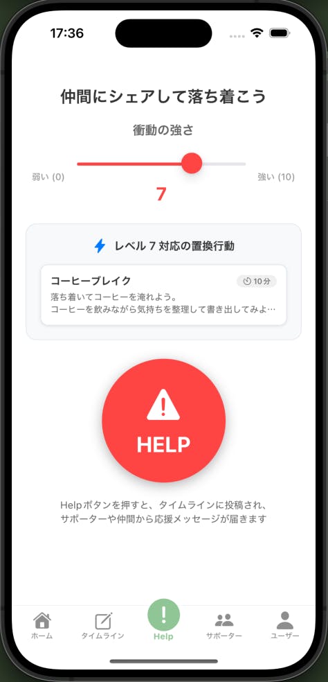 強い衝動を感じたら【ヘルプボタン】をタップするだけ。即座に同じ悩みを持つ仲間のタイムラインに共有され、サポーターに通知が飛びます。