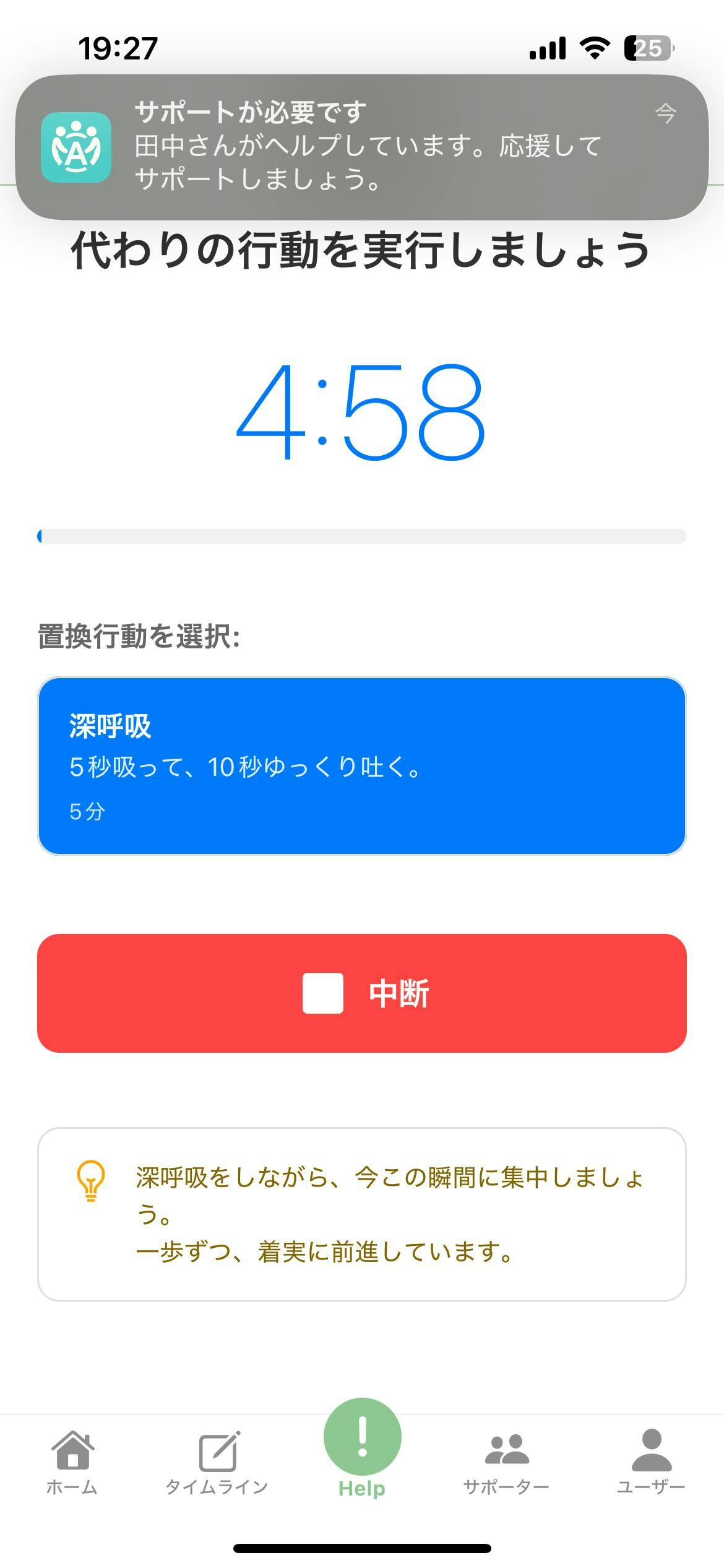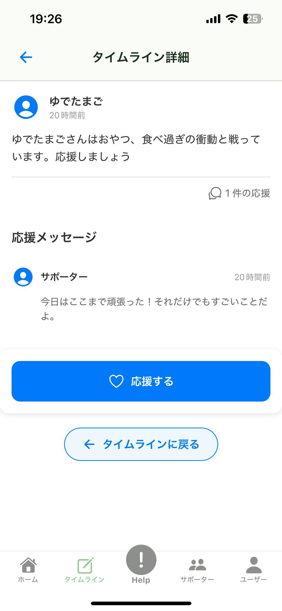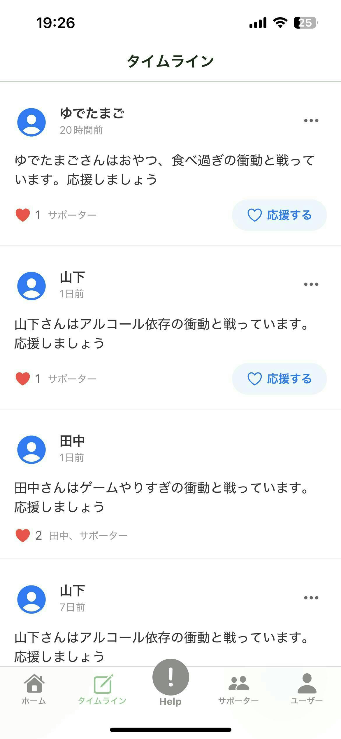 強い衝動を感じたら【ヘルプボタン】をタップするだけ。即座に同じ悩みを持つ仲間のタイムラインに共有され、サポーターに通知が飛びます。