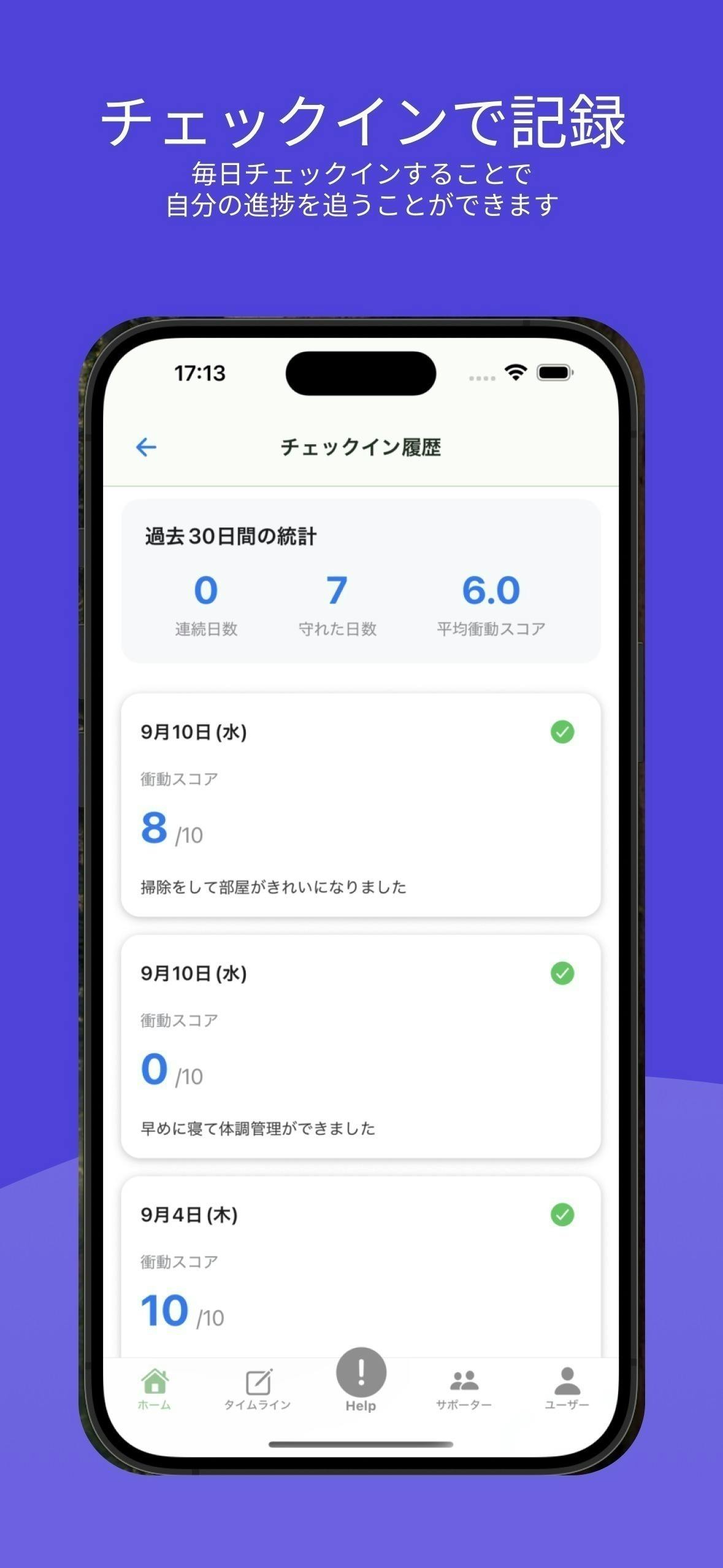 参加時にあなたのサポーターが割り当てられ、同時にあなたも誰かのサポーターになります。【誰かに見守られている】【誰かの役に立っている】という感覚が、継続の大きな原動力になるのです。毎日の強制チェックインで記録された小さな【できた】が、時間とともに大きな変化へ積み重なっていきます。