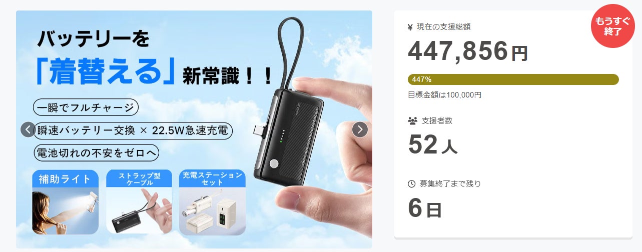 2026/03/02 09:28ご支援者の皆様先日公開した「カプセル着脱で即フル稼働。22.5W急速充電&補光ライト付バッテリー双方向充電器」プロジェクトは、応援購入目標金額を突破いたしました。おかげさまで、目標金額を達成できて、プロジェクトが成立となりました。ご支援に心より深く感謝しております。プロジェクトは始まったばかりです!!是非、SNSシェア等の商品拡散にもご協力いただけましたら幸いでございます。皆様に最高のサウンドをお届けするため、全力で頑張って参りますので、応援よろしくお願い致します! もっと見る