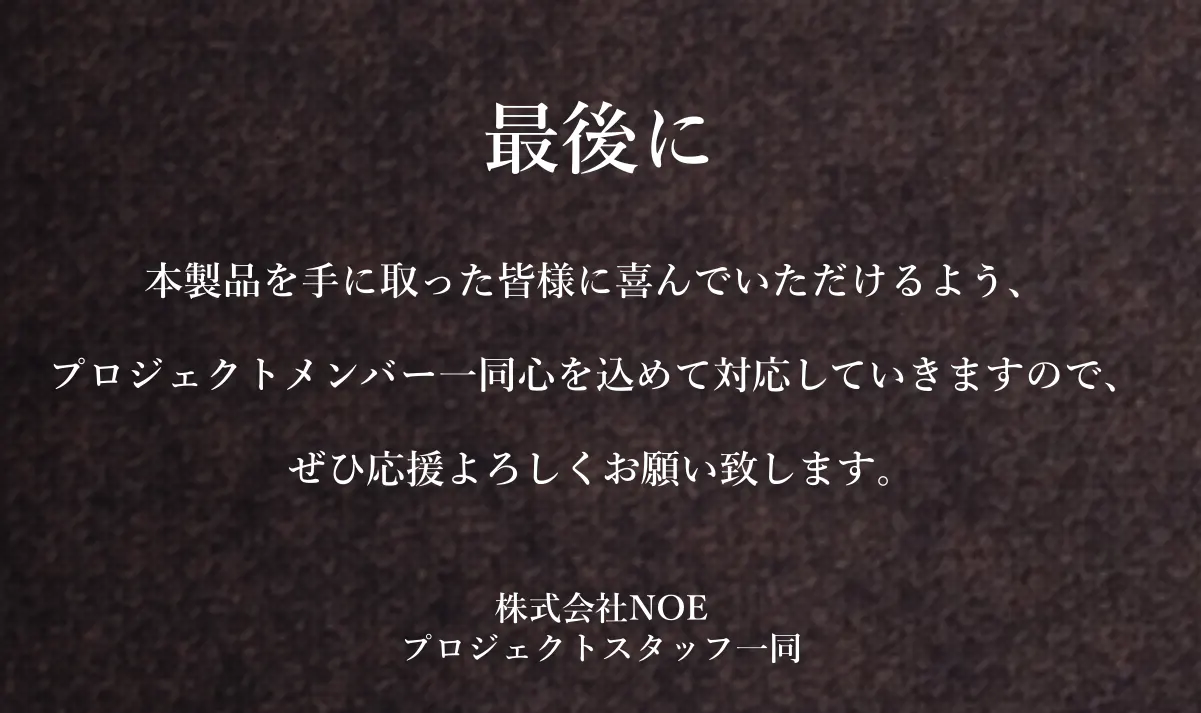 ※プロジェクト終了後、製品に関するお問い合わせは株式会社NOE掲載の弊社サポートセンターお問い合わせフォームへ(noe.info65@gmail.com)ご連絡ください。なお、プロジェクト終了後はキャンプファイヤー上のメッセージ機能などでの回答はいたしかねますので、予めご了承ください。