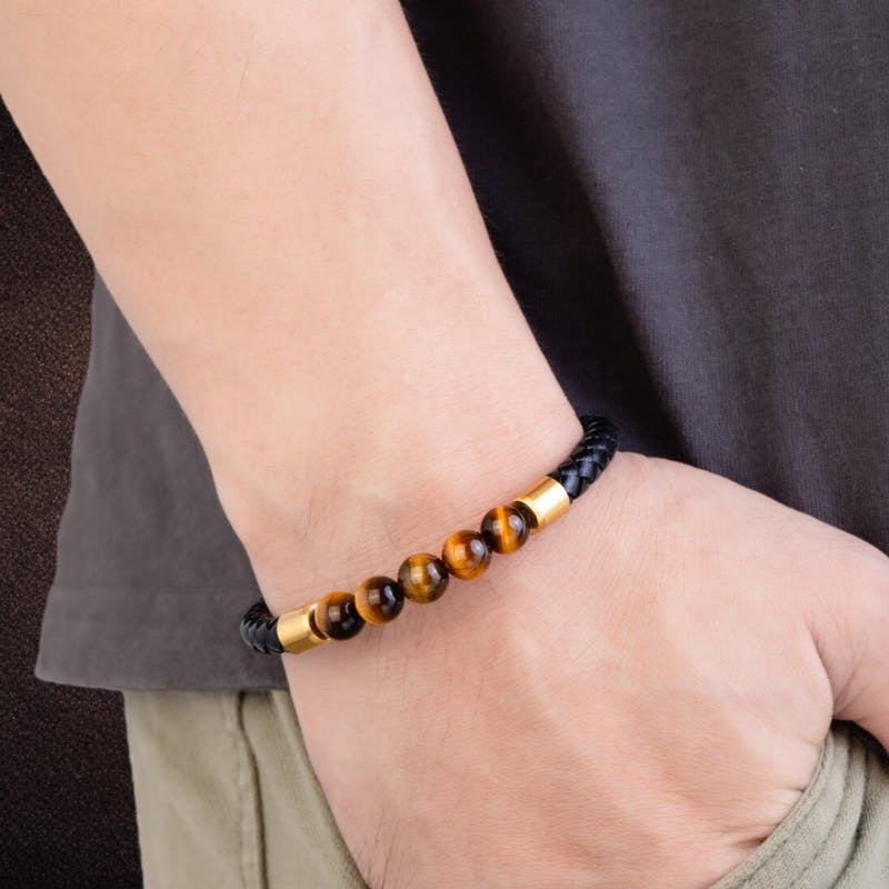 このブレスレットは落ち着いた質感の編み込みレザーとタイガーアイを組み合わせ、