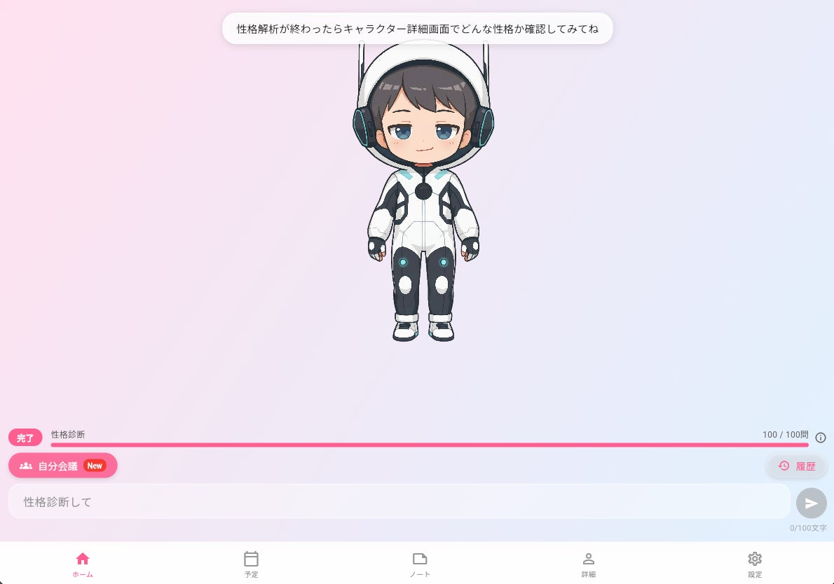 2026/02/11 21:30皆様こんにちは!最近始めたこのプロジェクトですが、広告の仕方もわからずでひたすら実装の方を進めてしまっています!そんなこんなで、支援者1人もいないのに着手を始めたわけですが、、、すでに、ホーム画面がiOS版に近づいてきております!もちろんiOS版とは画面の大きさが違うので全く一緒にはなっていませんが、結構気に入ってます!早速チャットで話しかけてみました!「こんにちは!君が成長していくのがとっても嬉しいよ」一緒にこの子と切磋琢磨して成長していこうと思います!ちなみにホーム画面に半目のキャラクターが写っていますが、これは性格診断をして自分の性格の傾向に合わせたキャラクターが表示されています。このいたずらっ子みたいな感じ気に入っています!他の人はどんな性格で、どんな表情になるのでしょうか?全部で500種類弱用意したので、ぜひいろんな人に試して欲しいところです。。。サンプルコーナーこのキャラクターは名前はつけてないので、名前をつけてあげてください。AIだけどロボットすぎないキャラクターデザインにしました。 もっと見る
