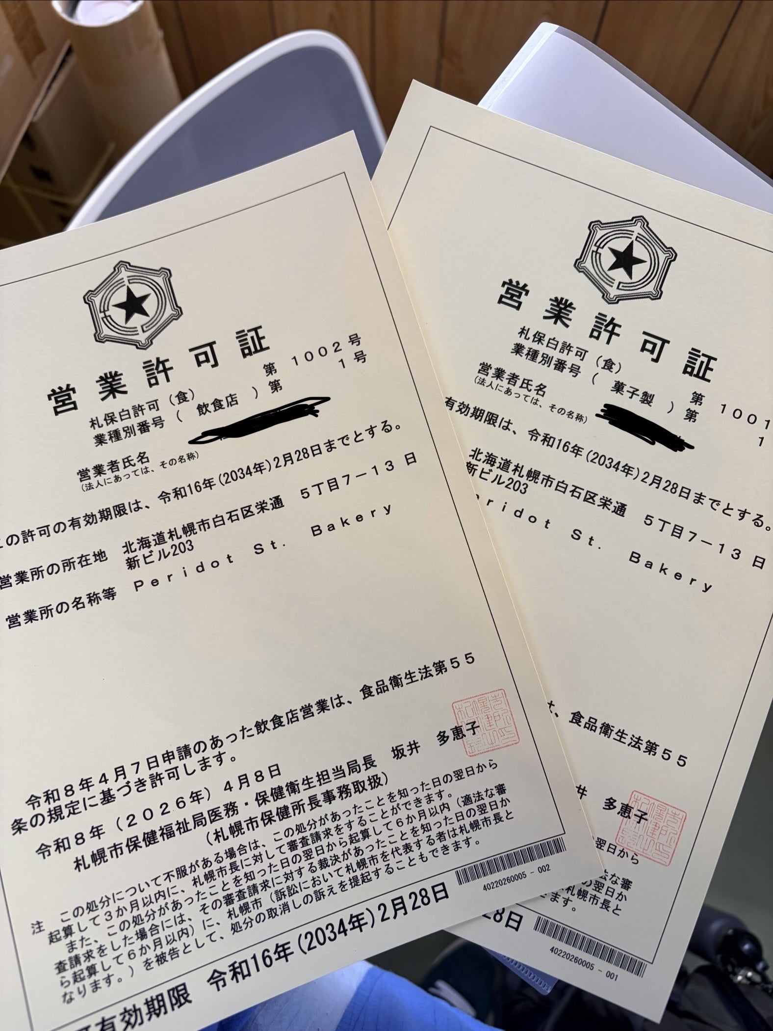 飲食店営業許可の申請と、菓子製造許可の申請も行い、こちらも無事承認されました!