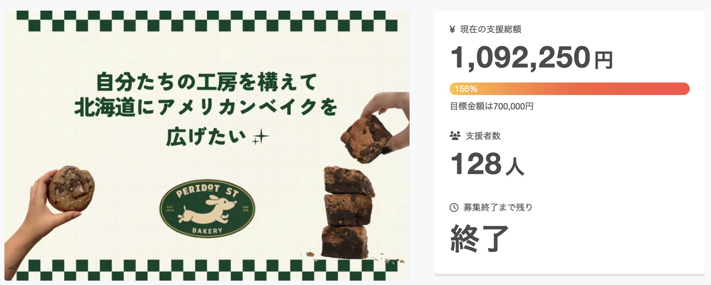 2026/04/01 11:331ヶ月間に及ぶクラウドファンディングが、目標を達成し無事終了しました!3月1日からバタバタと始まったクラウドファンディングでしたが、1ヶ月の支援募集期間を経て、昨日終了しました。結果は画像にある通り、・目標金額の70万円を達成!・最終金額は、なんと100万越え。目標金額に対して156%で着地・支援者は、日本全国(一部海外からも!)128名にも及びました。ご支援いただいた皆様、心より感謝を申し上げます。ありがとうございました。クラウドファンディング上の直接的な支援に限らず、SNS上でのシェアや反応、新規フォローなど、全て嬉しく受け止めております。工房の工事も順調に進み、まもなく引き渡し予定です!床工事が終わった後の様子。見違える仕上がりになったので、床を張り替えて良かった!!水回りもキッチンパネルのおかげで、ピカピカな印象に!機材が中に入ってきました。各種接続をいただいて、来週最終確認予定です。いただいた支援を元に買ったものをご紹介プロジェクトの期間と並行して、厨房機材店(とコストコ)を駆け巡っていました。・冷蔵庫・二層シンク・エアコン2台・ガスコンベクションオーブン・作業台3台・キッチンエイド(念願!!) などを買い揃えることができました!オーブンなど、なかなかな金額のものもあり、カードを切るときに不安に駆られましたが、無事プロジェクトが成功したため、安堵しています。今のオーブンのサイズにぴったりのクーラーを見つけました。ネットでは見つからなかったので、感動・・・。迫力があった機材店元々中古で検討していたオーブンが売り切れていたので、思い切って新品で用意できました!しかも、4月から値上げすると聞いて駆け込み。改めて、ご支援いただいた皆さまに感謝を申し上げます。今後のスケジュールとしては、・4月上旬〜中旬 引き渡し後、工房の掃除と立ち上げ(細かい機材を揃えるなど) 保健所の確認を経て、菓子製造許可を取得これ以降、リターンに取り掛かる予定です。今後も、活動報告でご案内できればと思っています!引き続き、どうぞよろしくお願いいたします。 もっと見る