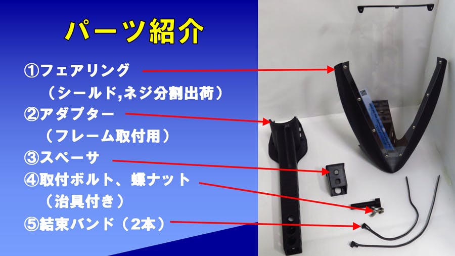 ・事前にフェアリングにシールドの組付け、アダプターに緩衝材、ゴムの接着等が必要です。詳細は組立要領書、取扱説明書をご参照ください.