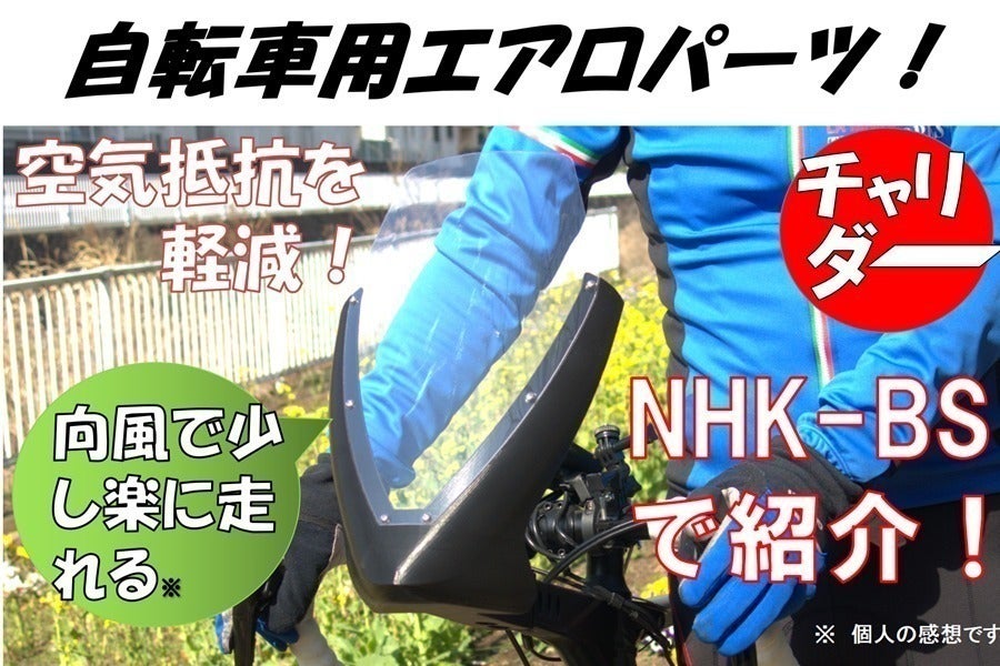 この自転車用フェアリングは、構造がシンプルで脱着が簡単、横風の影響が小さく、小型で軽量なのに空気抵抗が軽減されるユニークな構造です。独自開発のオリジナル製品のため、他では入手できません!