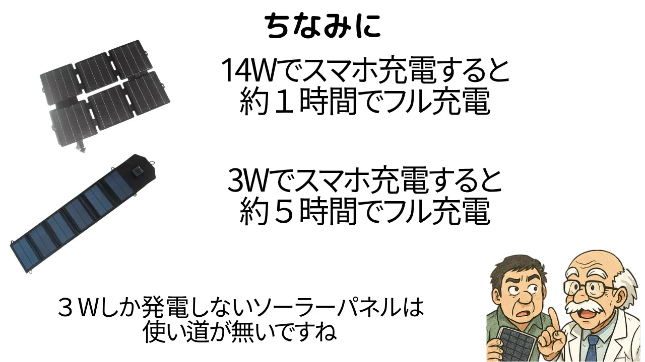 実際に比較してみると、9W対応を謡ってるソーラーパネルの出力はたったの3W。スマホ充電にかかる時間、なんと5時間以上…。これでは“いざという時”に頼れません。