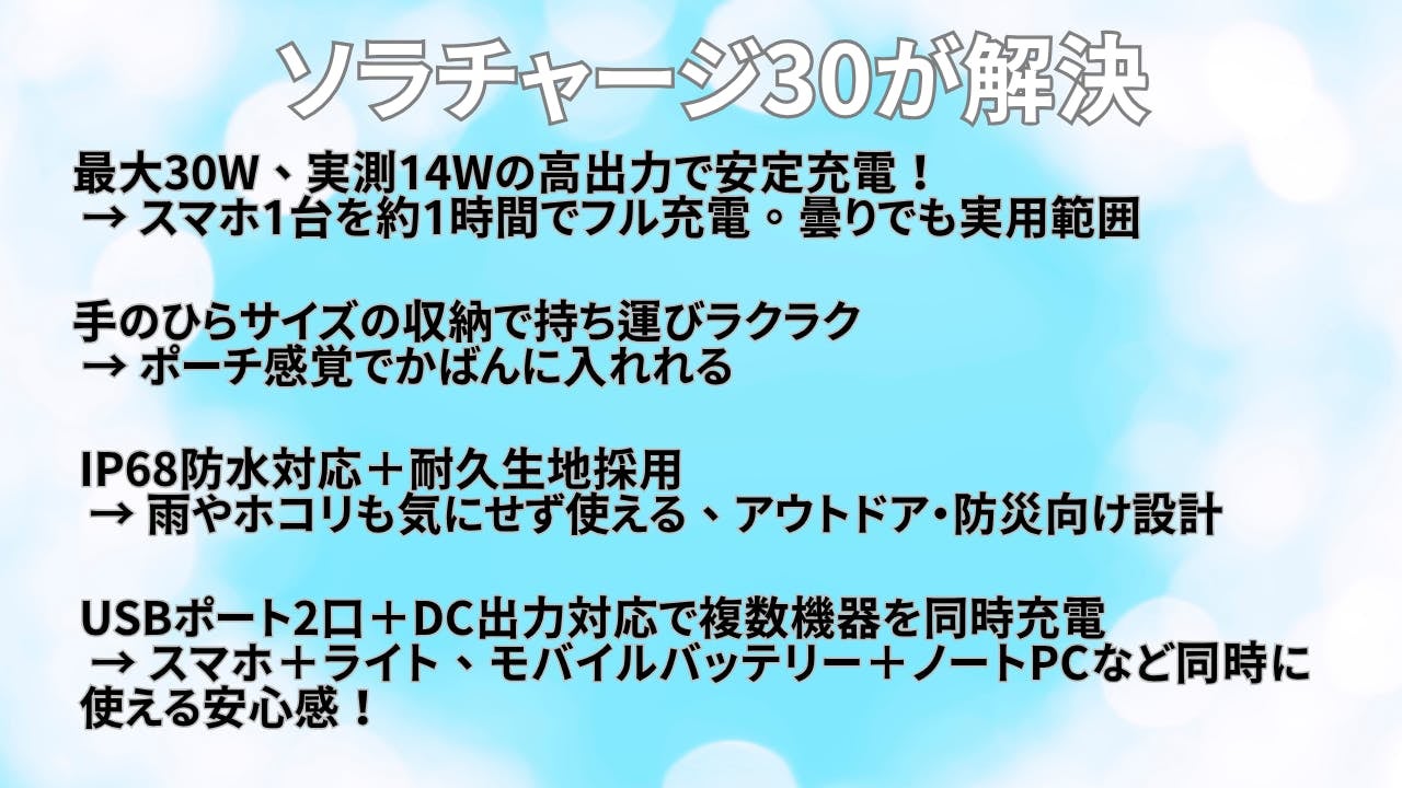 ☀️ 高効率30Wパネル搭載:太陽光を最大限に活かす単結晶パネルで安定充電