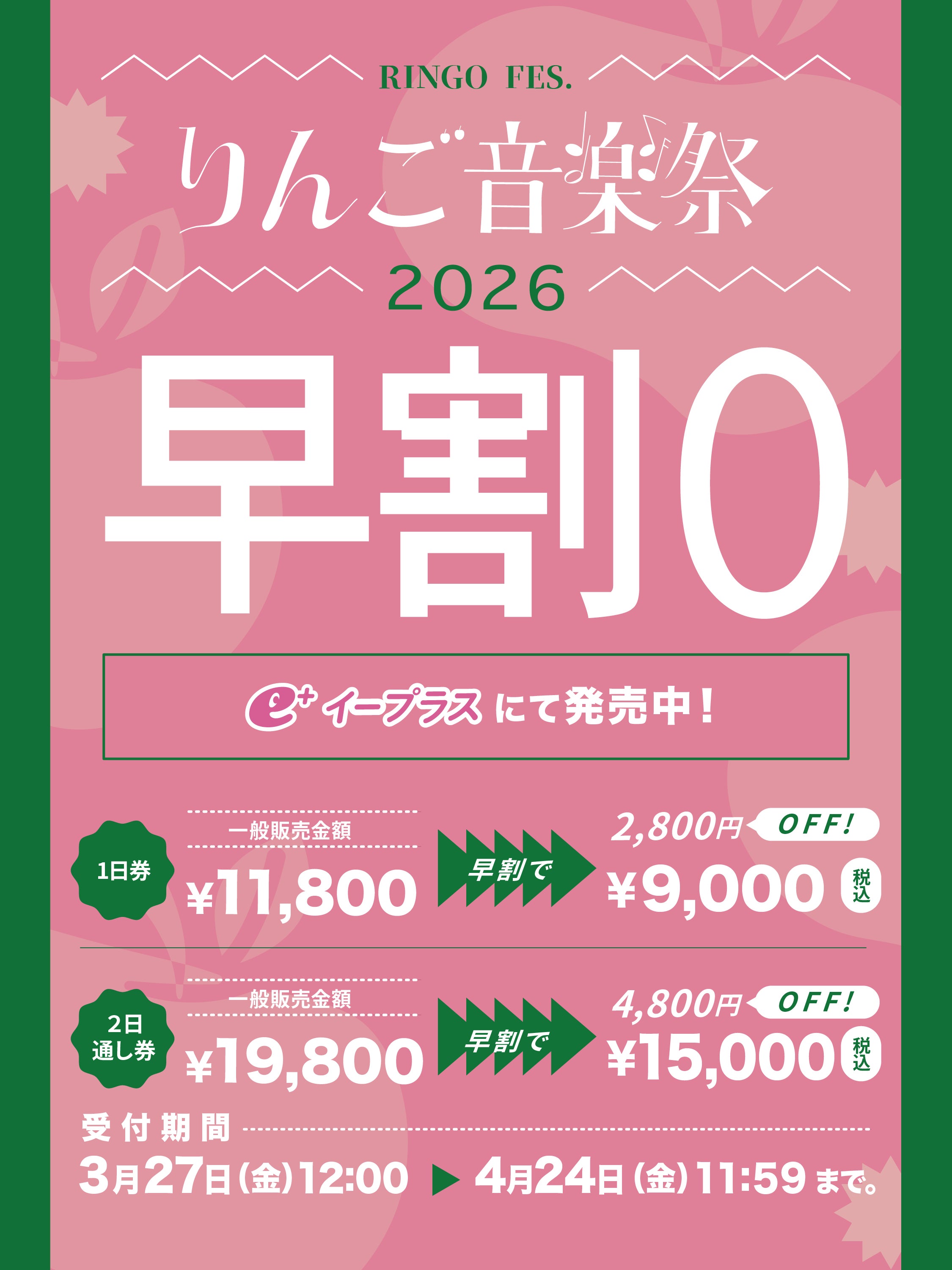 2026/03/27 13:58いつもりんご音楽祭を応援くださりありがとうございます。クラウドファンディングの成功を受け、2026年9月26日(土)〜27日(日)の2日間、長野県松本市アルプス公園にて野外音楽フェス「りんご音楽祭2026」の開催が決定しました!本日3月27日より、e+にて最安値となる【早割0】チケットの販売を開始しました。通し券・1日券のほか、オートキャンプ券・休憩広場券・駐車券も販売中です。【早割0】チケットは、今年度最もお得にりんご音楽祭へご参加いただけるチケットです。早割0~4、一般発売、当日券と順次価格が上がります。最安値でのご購入はこの機会をお見逃しなく!【早割0】チケット早割0 通し入場券 ¥15,000早割0 1日入場券 ¥9,0003月27日(金)12:00〜4月24日(金)11:59https://eplus.jp/ringofes2026/ もっと見る