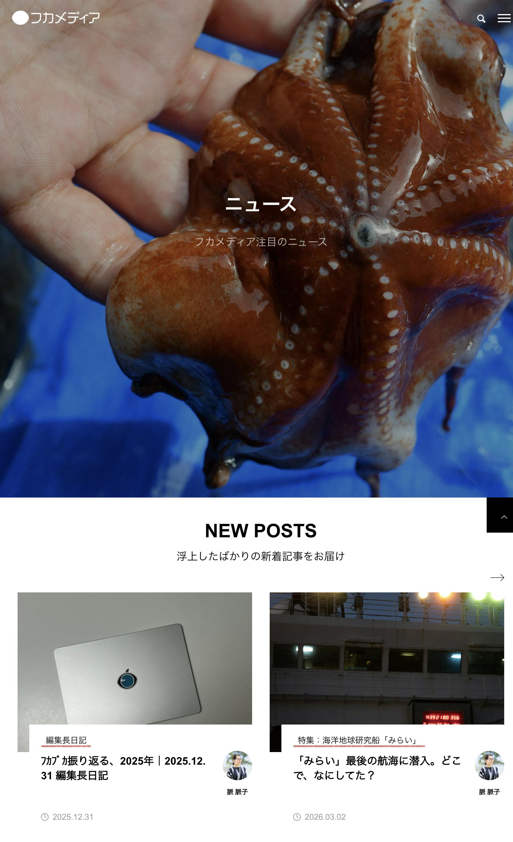 「フカメディア」は2024年1月にサイトをオープンした、深海に関する話題を専門にあつかうWEBメディアです。深海に心を寄せる2組の個人事業主が「深海にまつわることを伸びやかに報じられるメディアがないなぁ」と感じたことをきっかけに、ないならつくろう!と立ち上げました。