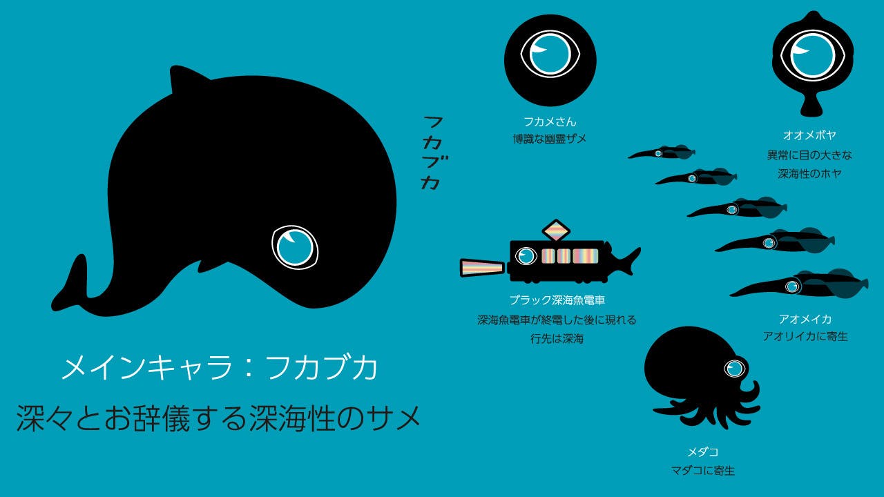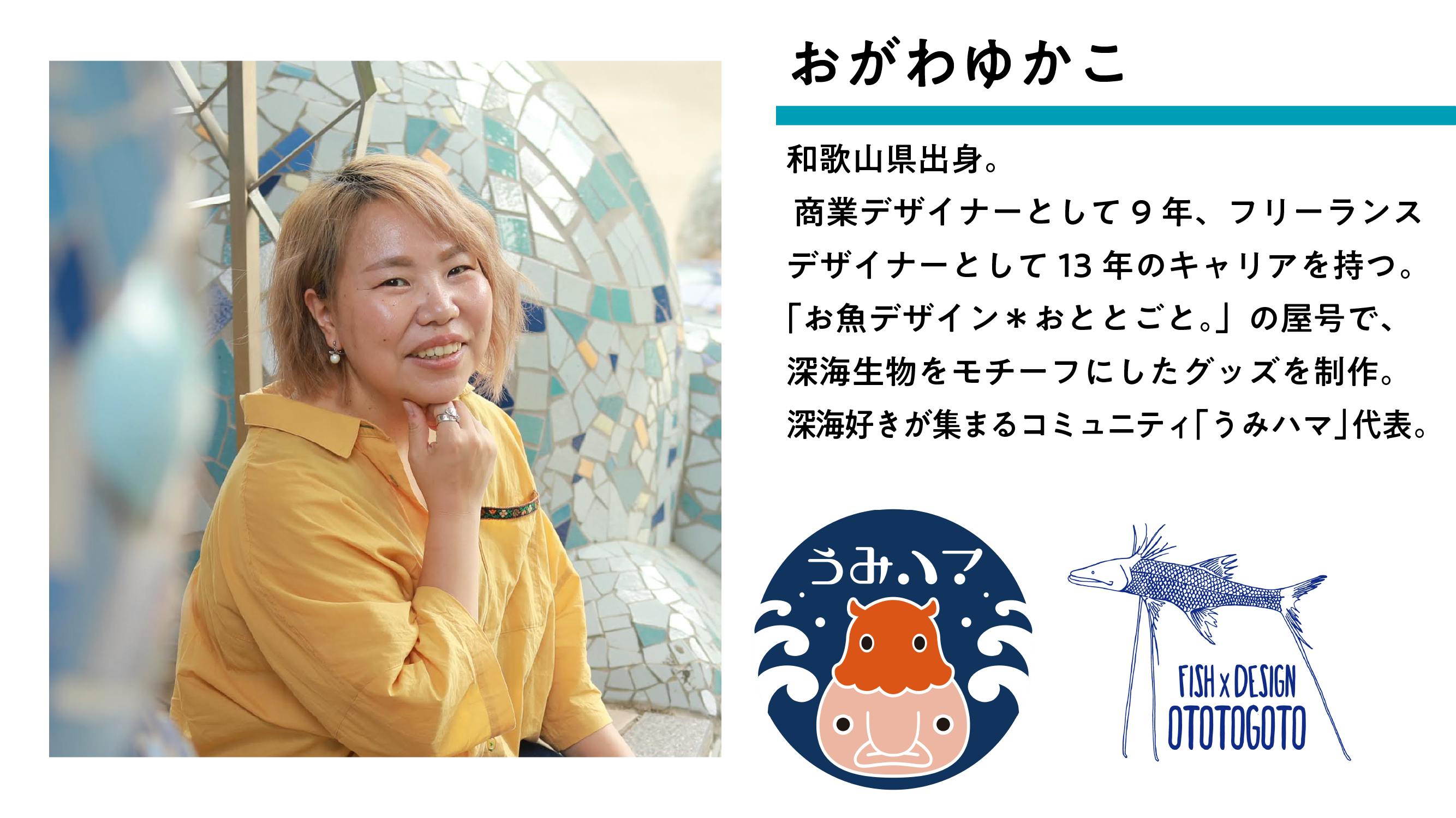 海好き、深海好きのコミュニティ「うみハマ〜深い海にハマる〜」を主宰し、プロのデザイナーとして20年以上のキャリアを持つ、「お魚デザイン*おととごと。」のおがわゆかこさん。ご自身でもオリジナルキャラクターを描き、グッズを制作しているおがわさん×フカメディアのコラボグッズにご期待ください。