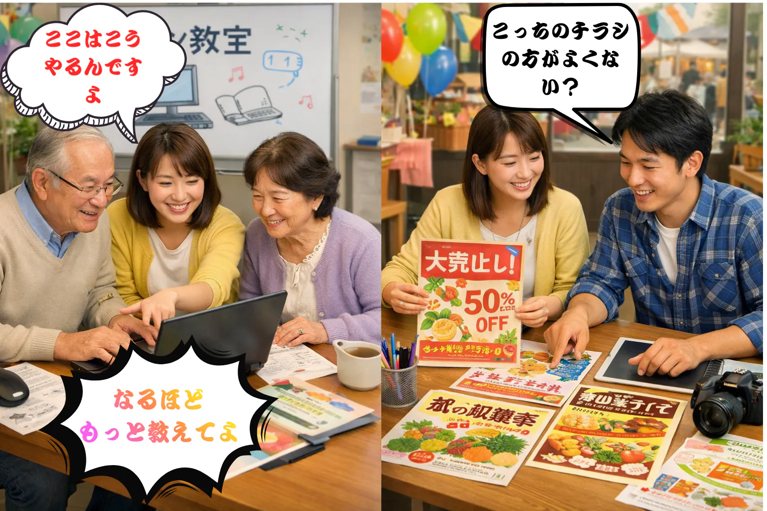 私自身の経験から、今まではパソコンは自分には出来ないし難しそうだしと思っていました。しかし心身を病んでパソコンと出会いやってみれば楽しいんだって思うようになりました。実際やってみないとわからない世界もあるんだって思いパソコンが段々楽しくなってきました。他にもやりたいけどきっかけがないしなど思ってる方とかいると思います。そんな方のちょっとしたきっかけ作りができればなって思ってます。自分自身、人見知りな所もあるのですが、地域のお店の方から「こんなチラシ作って欲しいんだけど」とかシニアの方と、ただパソコン触ってみようみたいなことが出来れば自分の人見知りの少しは良くなっていくのかなって思ってます。