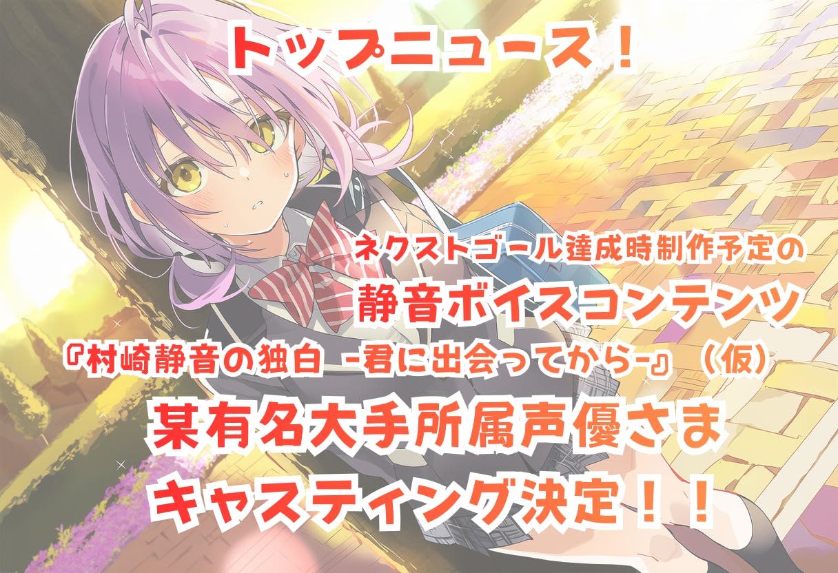 2026/03/18 07:48日頃より応援、誠にありがとうございます!『村崎静音は笑わない。』クラウドファンディング、ネクストゴールを3月17日、目標額ぴったりで達成いたしました!ご支援、本当にありがとうございます!このお力で、物語はさらに一歩先へ!初めてのメディアミックス・プロジェクトであるメインヒロイン、静音キャラボイスコンテンツの制作が決定!『村崎静音の独白 -君に出会ってから-(仮)』(約2000文字・8分)※全支援者さまを対象に配布予定!声を失った静音が主人公と出会い、変わっていく静音の内面をモノローグ形式でエモーショナルに、ドラマチックに表現!担当声優さまが彩る珠玉の作品を、ぜひお楽しみに!クラウドファンディングは残り13日!さらに前へ、上を目指します!次なる企画とは…!?引き続き、応援よろしくお願いいたします! もっと見るあと14日、残り8,000円…!