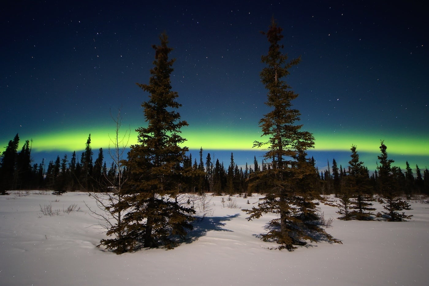 これは去年ユーコンを訪れた際に撮影したもの。 ユーコンの原野の奥に月明かりを頼りに入って行った時に、遠くにオーロラが出たのでタイガの森と合わせて撮ってみました。