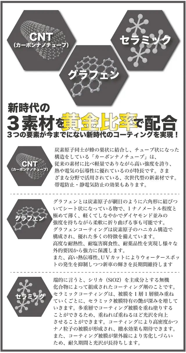 カーボンナノチューブの導電性、グラフェンの定着性、セラミックの艶・撥水性が相互に補完し合い、洗車コーティングは完全に次のレベルへ!
