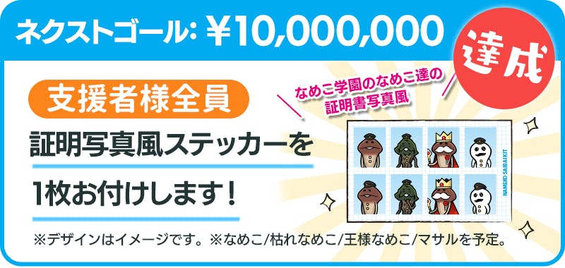 大好きななめこに会えるのがとってもたのしみです!🤍 今回も追加のリターンは計画されているのでしょうか(>_<。) イベントにちなんだぬいぐるみやグッズのリターンが増えたらぜひ追加で支援させていただきたいです!