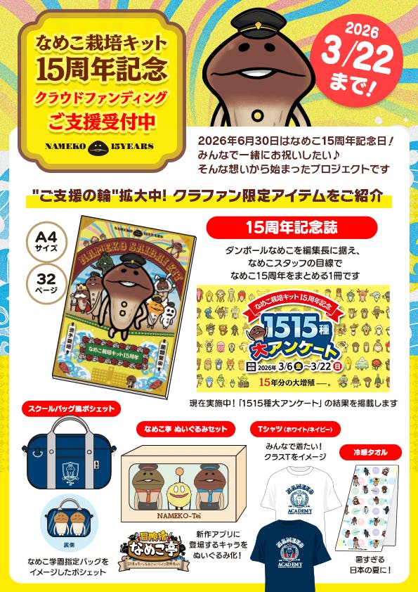 2026/03/06 15:11いつもなめこクラファンプロジェクトに応援をいただき誠にありがとうございます。プロジェクトをさらに盛り上げるべく・新プラン追加・なめこ1515種大アンケートを実施いたしますのでお知らせさせていただきます。新プラン「ぬいぐるみセット」追加!!現在鋭意開発中の新作アプリ『冒険宿 なめこ亭 〜記憶を失いしなめことハラペコ冒険者たち〜』に登場するキャラクターをぬいぐるみ化します!新作アプリ開発中のお知らせ(X)本プランをご支援いただいた方に新作アプリのスクープ記事が掲載された「なめこ学園 新聞部の壁新聞(縮小版)」をお付けします!新プランは「プロジェクトを支援する」ボタンからご支援いただけます。■ぬいぐるみ3体■なめこタイプ全長約13cm■カラビナ付き■なめこ学園 新聞部の壁新聞(縮小版)A4サイズ 1枚付き※「なめこ学園 新聞部の壁新聞(縮小版)」は本プラン1セットごとに1枚お付けします。※「なめこ学園 新聞部の壁新聞(縮小版)」と同じ内容を15周年記念誌にも掲載予定です。※「なめこ学園 新聞部の壁新聞(縮小版)」は半分に折った状態でのお届けを予定しております。なめこ1515種大アンケート開催「なめこ栽培キット10周年」で実施した1101種総選挙から5年の時を経て、対象キャラクター数1515種の大大大ボリュームになって帰ってきました!!その名も「なめこ栽培キット15周年記念 1515種大アンケート」!!アンケートページはこちらリアルイベント「なめこ学園 学園祭」を開催することにちなみ、文集や卒業アルバムでお馴染みのクラスアンケート風の設問をご用意しました。設問数は全15問です。最もイメージに近いなめこを1種類ずつお選びください!!さらに「推しなめこ」調査のための設問が最後に1問あります。回答の送信は15問+1問への入力が必須となります。アンケートフォームが長すぎて大変恐れ入りますが、ぜひ心してご回答いただけますと幸いです。==============なめこ栽培キット15周年記念 1515種大アンケート【投票期間】2026年3月6日(金)〜3月22日(日)23:59【開票結果発表】クラウドファンディング返礼品「15周年記念誌」および「15周年記念イベント」内【投票ルール】期間中に何度回答してもOKです※投票を確定するためには、ページ最下部の「送信」を押す必要があります==============本プロジェクトも折り返しを迎えました。引き続きご支援、SNSでの拡散にご協力をいただけますと幸いです!! もっと見る