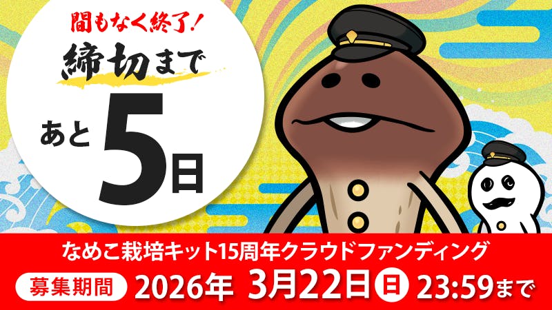 2026/03/17 19:13お世話になっております!プロジェクトも残すところあと5日となりました。昨日活動報告を上げたところ多くの反響をいただきまして、残り期間毎日活動報告を上げていこうと考えています。1515種アンケートへの回答はお済みですか?「なめこ栽培キット10周年」で実施した1101種総選挙から5年の時を経て、対象キャラクター数1515種の大大大ボリュームになって帰ってきました!!その名も「なめこ栽培キット15周年記念 1515種大アンケート」!!アンケートページはこちらリアルイベント「なめこ学園 学園祭」を開催することにちなみ、文集や卒業アルバムでお馴染みのクラスアンケート風の設問をご用意しました。設問数は全15問です。最もイメージに近いなめこを1種類ずつお選びください!!さらに「推しなめこ」調査のための設問が最後に1問あります。回答の送信は15問+1問への入力が必須となります。アンケートフォームが長すぎて大変恐れ入りますが、ぜひ心してご回答いただけますと幸いです。==============なめこ栽培キット15周年記念 1515種大アンケート【投票期間】2026年3月6日(金)〜3月22日(日)23:59【開票結果発表】クラウドファンディング返礼品「15周年記念誌」および「15周年記念イベント」内【投票ルール】期間中に何度回答してもOKです※投票を確定するためには、ページ最下部の「送信」を押す必要があります==============ーーーーーーーーーー応援メッセージありがとうございます!ーーーーーーーーーー「ネクストゴール1000万円」達成目前!!引き続き応援よろしくお願いいたします!! もっと見る