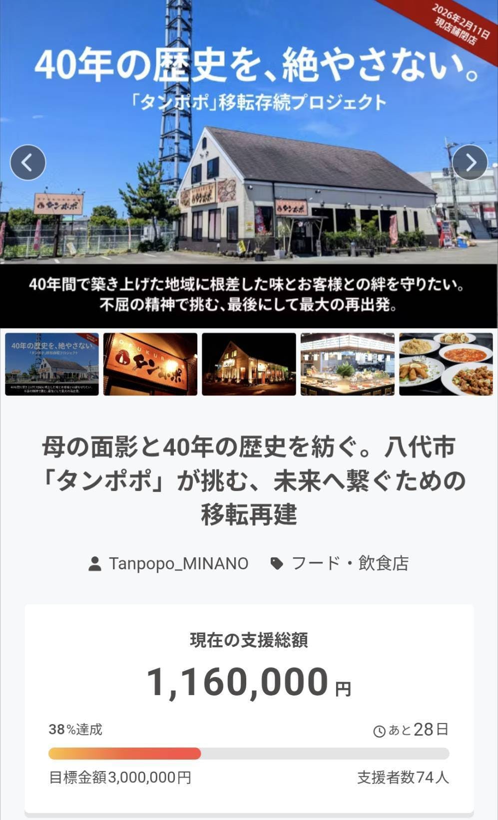 2026/03/04 11:30皆さま、温かいご支援を本当にありがとうございます!プロジェクト開始から現在まで、74名もの方々から総額1,160,000円にのぼるご支援をいただきました。目標金額の38%に到達し、皆さまから託された想いの重さを改めて身に染みて感じております。「40年の歴史を、絶やさない。」このプロジェクトのトップに掲げた言葉は、私たちが最も大切にしている決意です。大村の店舗は一度幕を閉じましたが、八代での「タンポポ」移転再建は、単なるお店の引っ越しではありません。母が築き、40年間地域に根差してきた味。そして、お客様と紡いできたかけがえのない絆。 次の場所へと繋いでいくための、私たちにとって「最後にして最大の挑戦」です。皆さまからの「応援してるよ!」「またあの味を食べたい」という応援コメントの一つひとつが、準備に奔走する私たちの大きな原動力になっています。ここで少し進捗のご報告です。 少し事後報告となってしまいましたが、大村店舗の撤収作業も無事に終了し、現在は次の店舗の再始動に向けて、関係各所との調整を精力的に進めております。新店舗のオープンまでには、これから数か月の準備期間を要する予定です。具体的なオープン日や場所が決まりましたら、改めてこちらの活動報告やSNS等で真っ先にご報告させていただきます。皆さまとまた笑顔でお会いできるよう、一歩ずつ着実に準備を進めてまいります。プロジェクト終了まで残り28日。 目標金額3,000,000円の達成に向けて、一歩ずつ、しかし力強く進んでまいります。引き続き、本プロジェクトのシェアや拡散での応援もいただけますと幸いです。今後ともよろしくお願いいたします。 もっと見る