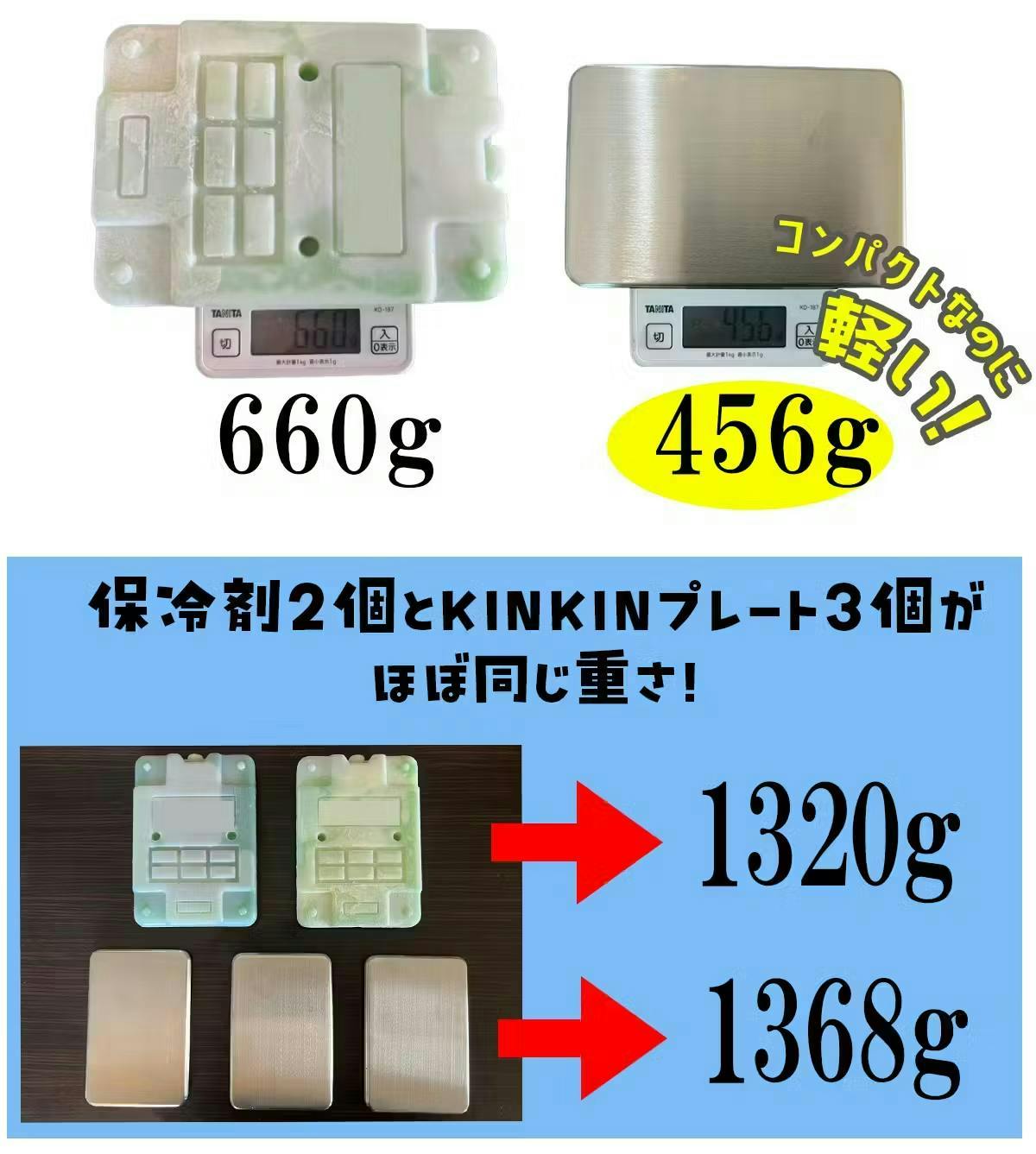 一般的な保冷材より、コンパクト且つ軽量なので、一般的な保冷剤2個分で、KINKINプレート2個の大きさ且つ重さなのです!