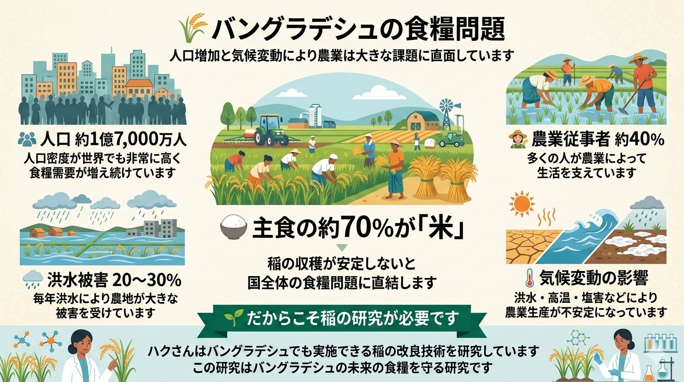 ハクさんは、母国バングラデシュの食糧問題を解決したいという強い思いを持って日本に来た留学生です。