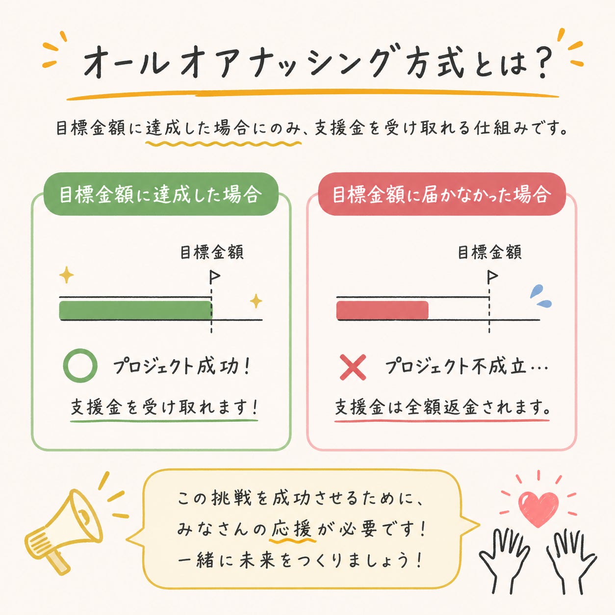 この方式は、一見ハードルが高いようにも感じられますが、その分「本当に実現したい」という強い想いや覚悟が試される仕組みでもあります。また、支援してくださる方にとっても、「このプロジェクトを成功させたい」という気持ちを共有できる点が大きな魅力です。