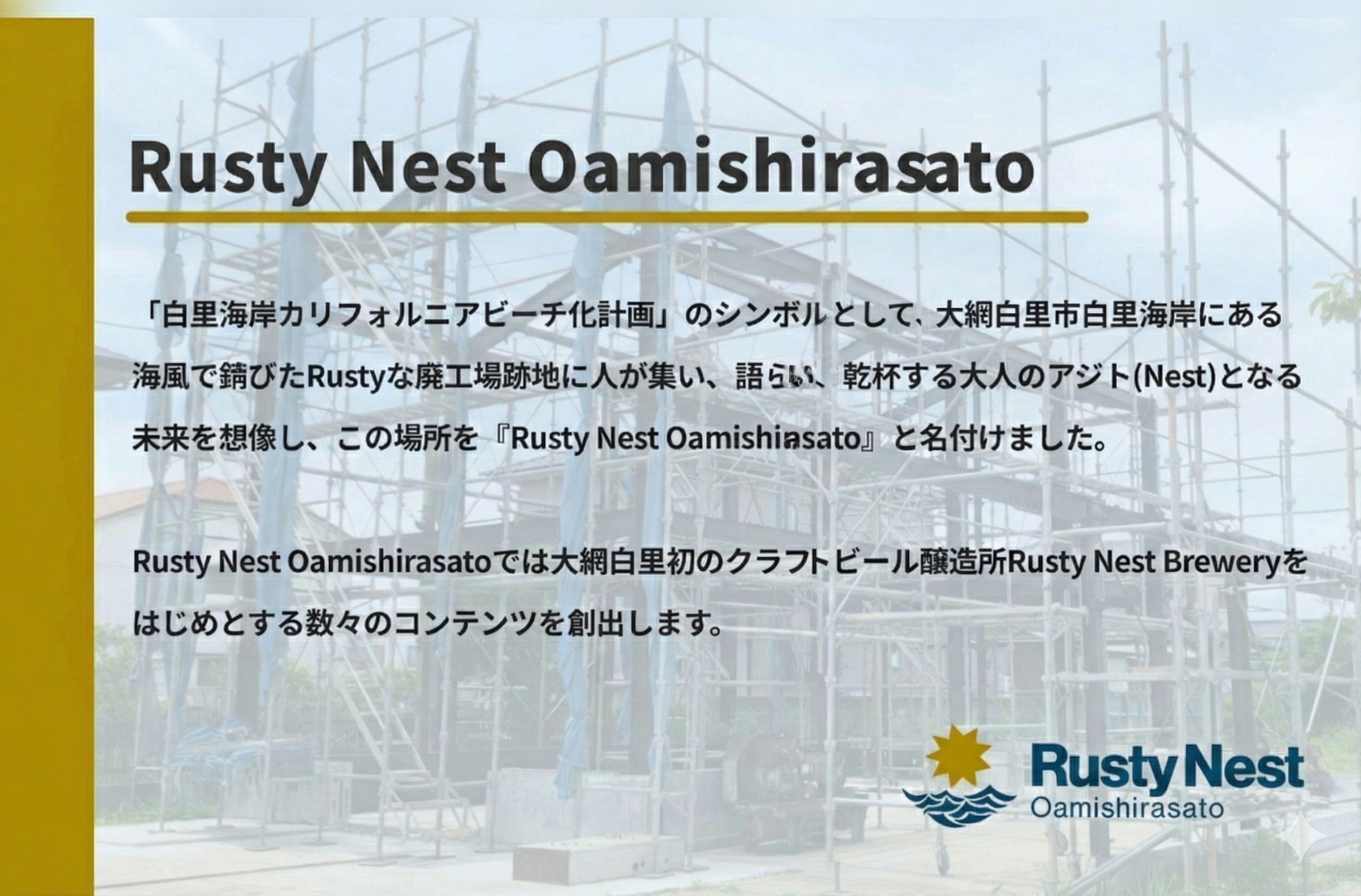かつての廃工場が、人の集まる「巣(Nest)」へと生まれ変わる。その歴史的な一歩を、私たちのラガービールと共に、応援してくださる皆さまと一緒に踏み出したいと考えています。