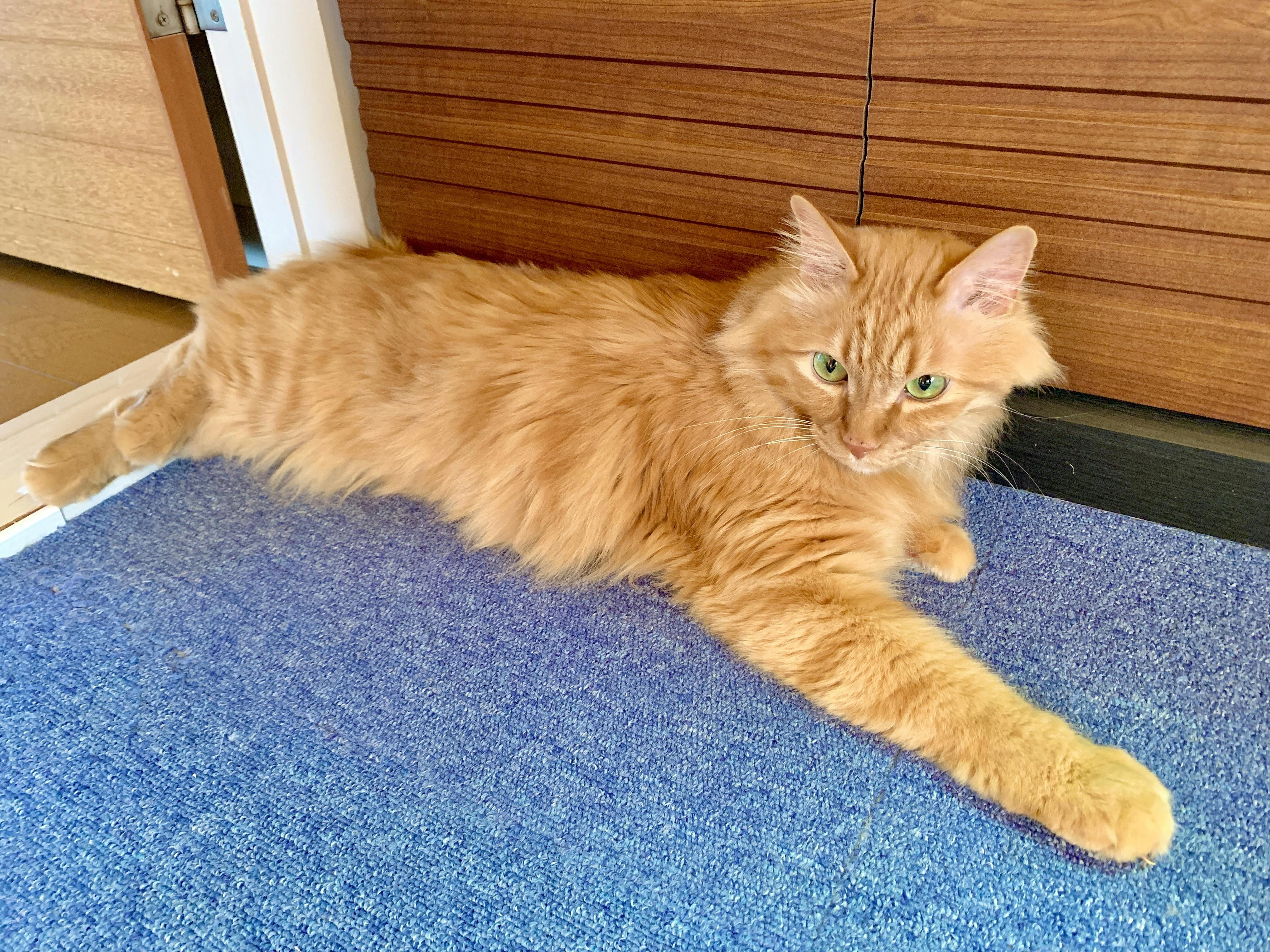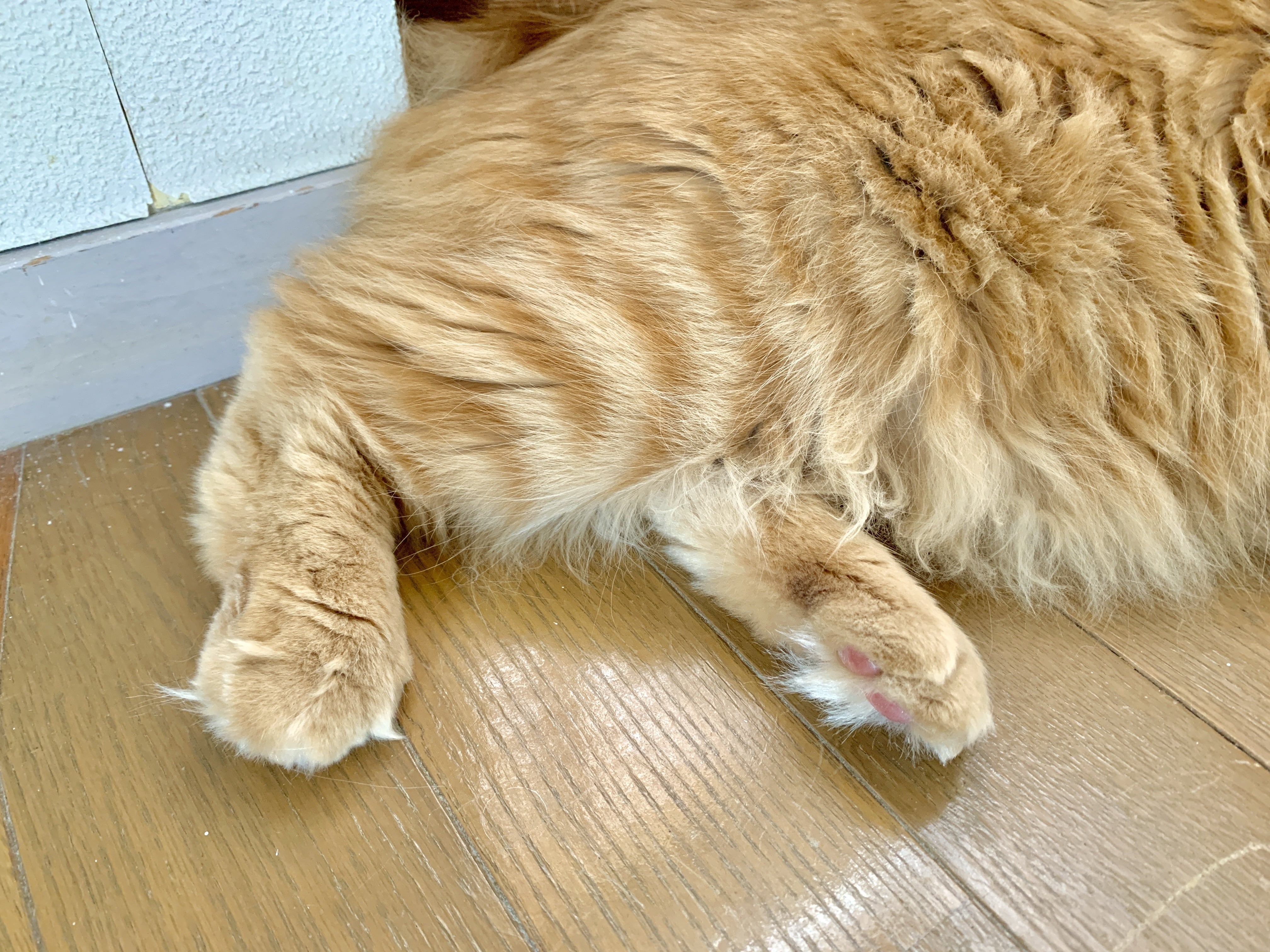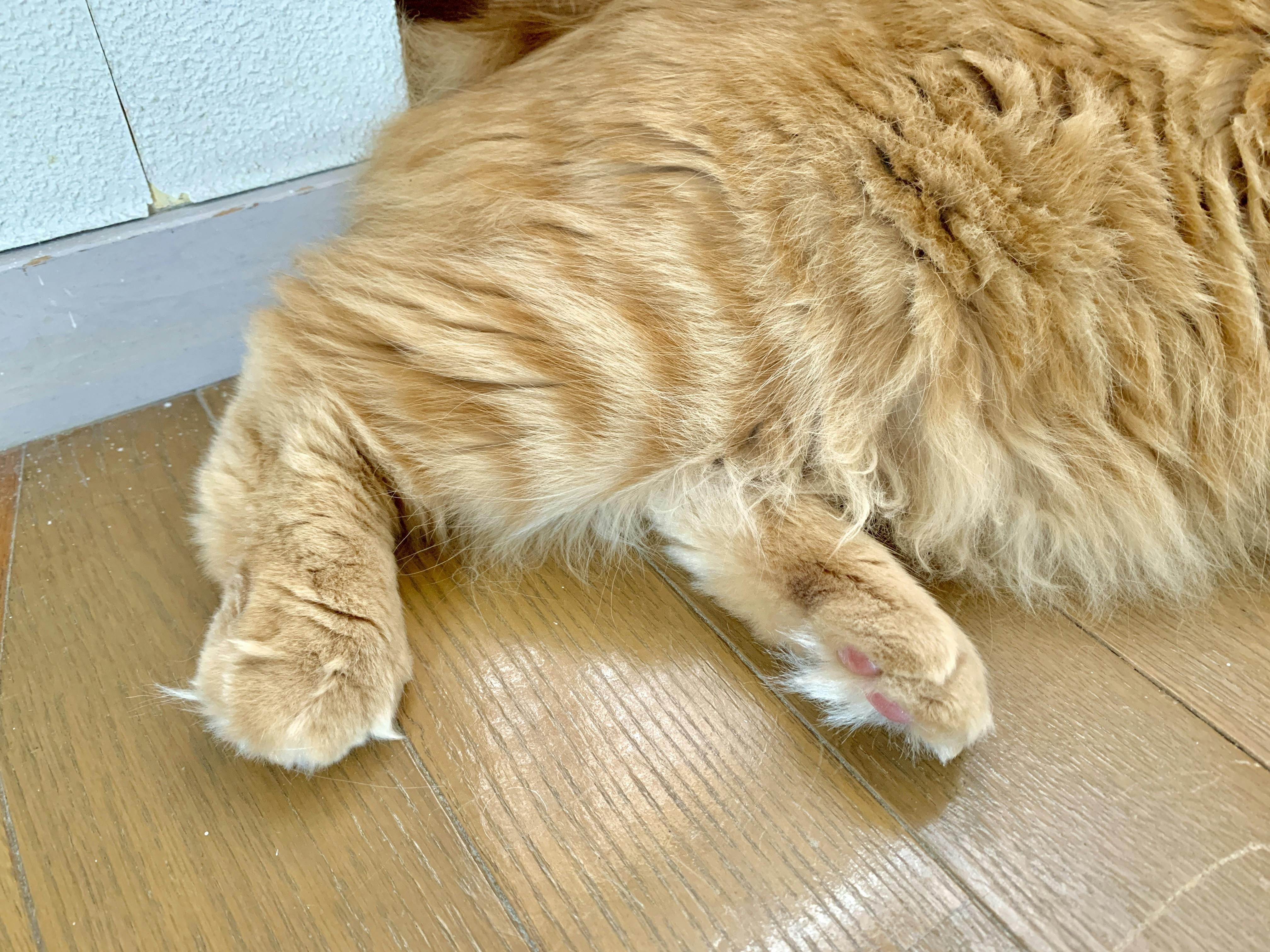 食いしん坊の大吉が朝ごはんを食べに来ないので、「おかしいな」と思って探したところ、右の後ろ脚を引きずりながら歩いているのを見つけました。右後ろ脚がキュッと丸くなっている